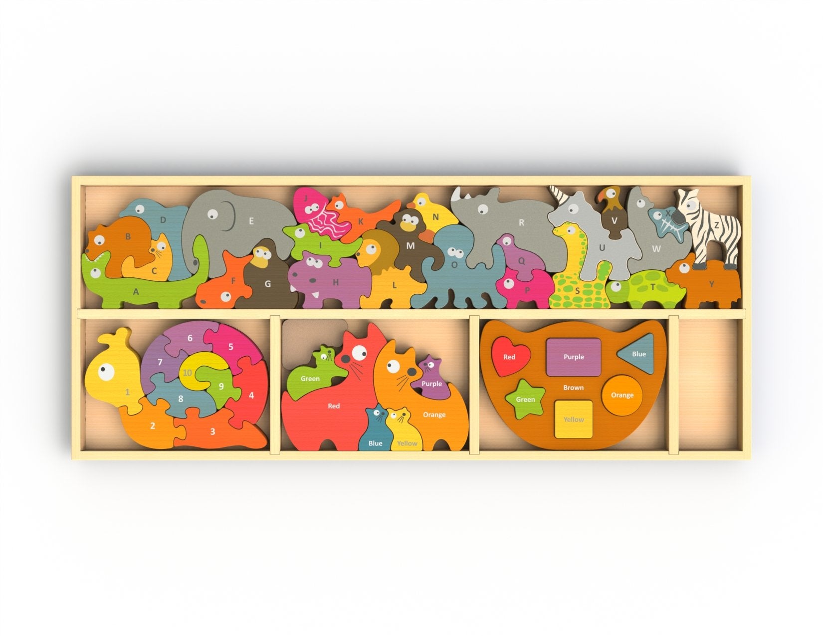 Barlowe's Learning Box combines 4 of BeginAgain's best selling educational puzzles, Animal Parade A-Z, Number Snail, Balance Boat Shapes and Colors and Cat Family. Measuring 22.75" x 9.75". Intended for ages 2 and Up. Based in Fort Collins, Colorado, BeginAgain draws inspiration for our fantastic, wacky and educational toys, games and puzzles from our big and beautiful world! We design toys that satisfy all styles of children’s playing, with no batteries required. Using sustainably harvested materials, BeginAgain works to benefit our kids and our environment.