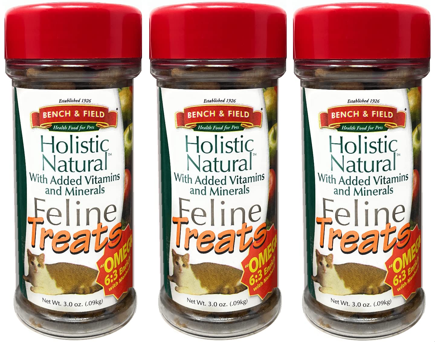 Finally, a wholesome, healthy treat for daily feeding. Bench & Field Holistic Natural Cat Treats are just the right choice for cats of all ages and the devoted owners who love them. Made with Anchovy and Sardine meals as the first two ingredients, your feline friend is sure to love these crunchy fish-shaped treats that are suitable for daily feeding. Wholesome and healthy, they’re enriched with Omega-3 and 6 fatty acids from menhaden oil and flaxseed to help rejuvenate your feline friend’s skin and give her a smooth, lustrous coat. Fortified with essential vitamins and minerals, these delicious snacks also contain prebiotics, probiotics and digestive enzymes for overall gut health, along with DHA and L-Carnitine. This is a treat that cats absolutely love!