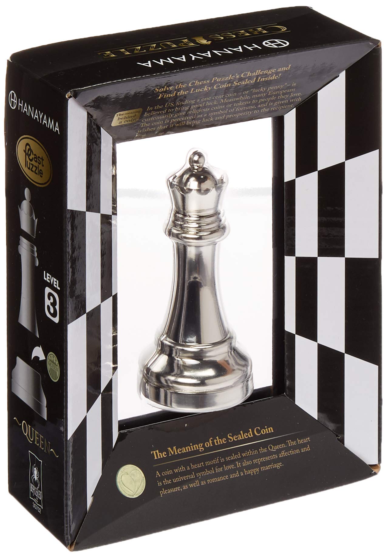 Solve the chess puzzle's challenge and find the lucky coin sealed inside! Hanayama chess piece puzzles are brain teasers built into high quality chess puzzle pieces. Each cast metal, chrome-plated chess piece requires a different solution to open it and collect the cast-plated gold token hidden inside.hanayama cast chess puzzles are recommended for ages 8 and up. BePuzzled is the exclusive distributor of Hanayama cast puzzles in the USA. Designed by marcel Gillen of Luxembourg.