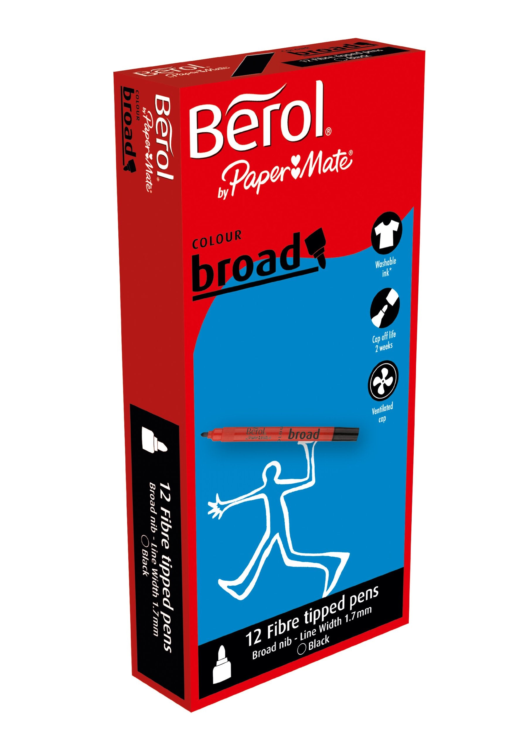 DescriptionProduct DescriptionThe Berol by Paper Mate range of colouring pens contains ink reservoirs that fill almost the whole length of the barrel. The ink is filled throughout the length of the pens. Washable ink - will wash out of most fabrics and hands and is removable on most porous surfaces.Box Contains12 x Berol Colour Broad pens - black