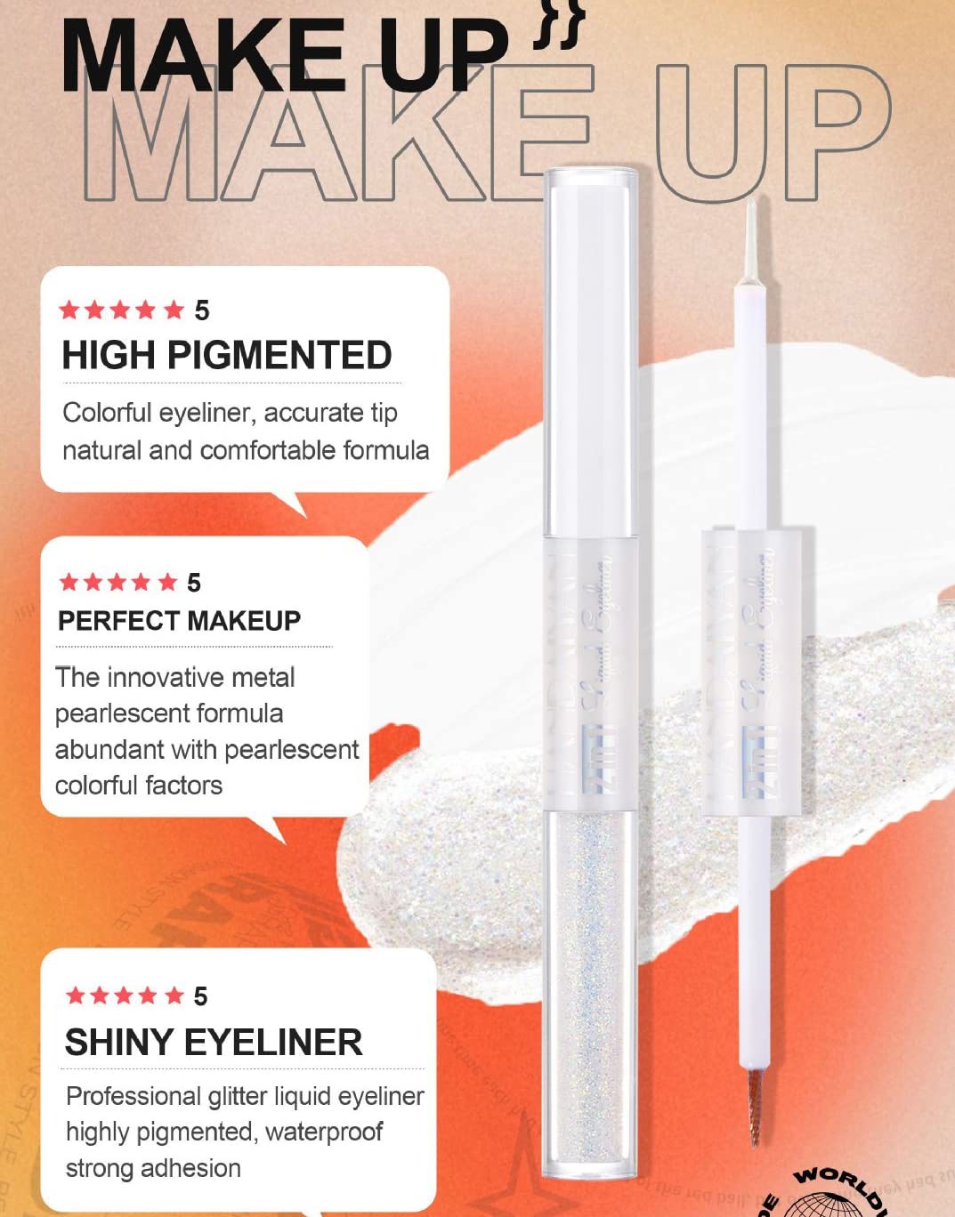 Elevate your eye makeup game with our Matte & Glitter Liquid Eyeliner. Our dual effect formula gives you the best of both worlds - a stunning matte and a dazzling glitter finish that will make your eyes pop. The precision brush tip makes it easy to create any look you want - from thin, natural lines to bold, dramatic strokes. It glides on smoothly and dries quickly, so you don't have to worry about making mistakes. Our liquid eyeliner is smudge-proof, waterproof, sweat-proof and tear-proof, so you can wear it with confidence in any situation. It stays put all day, without smudging or fading. Whether you're going for a natural, everyday look or a glamorous, party-ready look, our liquid eyeliner can be used for any occasion. It's long-lasting and won't flake or peel, so you can enjoy your beautiful eye makeup all day and night. We care about your health and safety, which is why our liquid eyeliner is made with safe, non-toxic ingredients that are gentle on your skin. It's also cruelty-free and vegan, so you can feel good about using it. Our Matte & Glitter Liquid Eyeliner comes in a variety of colors, so you can choose the perfect shade to match your style and mood. Add it to your makeup collection today and take your eye makeup to the next level.