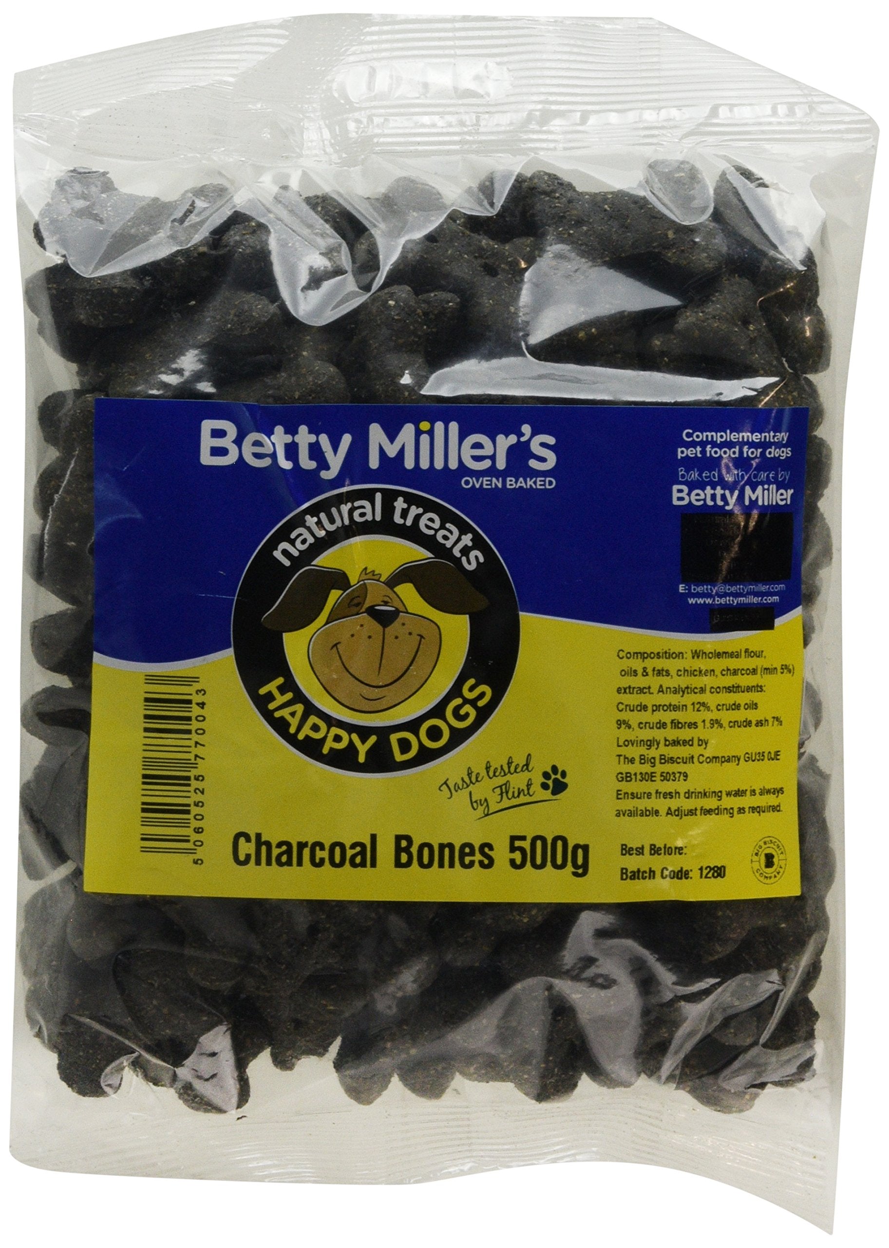 DescriptionProduct DescriptionMade to one of Betty Miller's classic recipes, these biscuits are an old favourite with breeders. Charcoal is known to aid with digestion and can even help with flatulence, making things that little bit better for everyone.Betty Miller produce all their food and treats using simple, wholesome ingredients, in the same way you would if you were making them at home. By oven baking the treats they keep the natural taste without the need to add anything. The treats contain no artificial colours, preservatives, added salt or sugar, only good, natural, quality ingredients.IngredientsWholemeal flour, rye, oils & fats, chicken, charcoal (min 5%)DirectionsStore in a cool and dry placeBox ContainsDog Treat