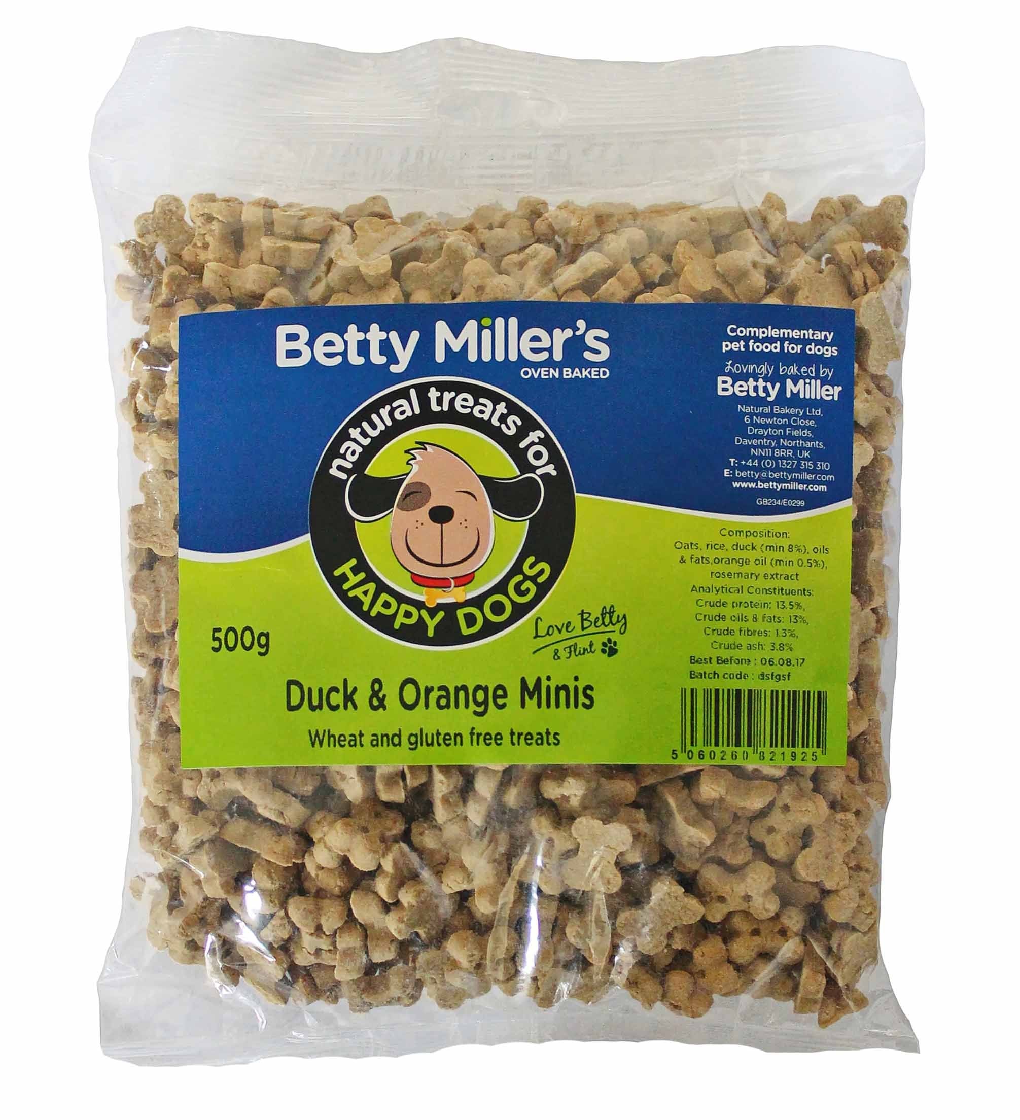 DescriptionProduct DescriptionBetty Miller's Wheat Gluten Free Duck & Orange Minis are delicious, and a great alternative to chicken. They are oven baked with no preservatives or additives and of course no wheat. At the bakery, we have made the prefect Duck treat for your dog.IngredientsComposition: Oats, rice, duck (min 8%), oils& fats, orange oil (min 0.5%), rosemary extractBox ContainsDog Treat/Food