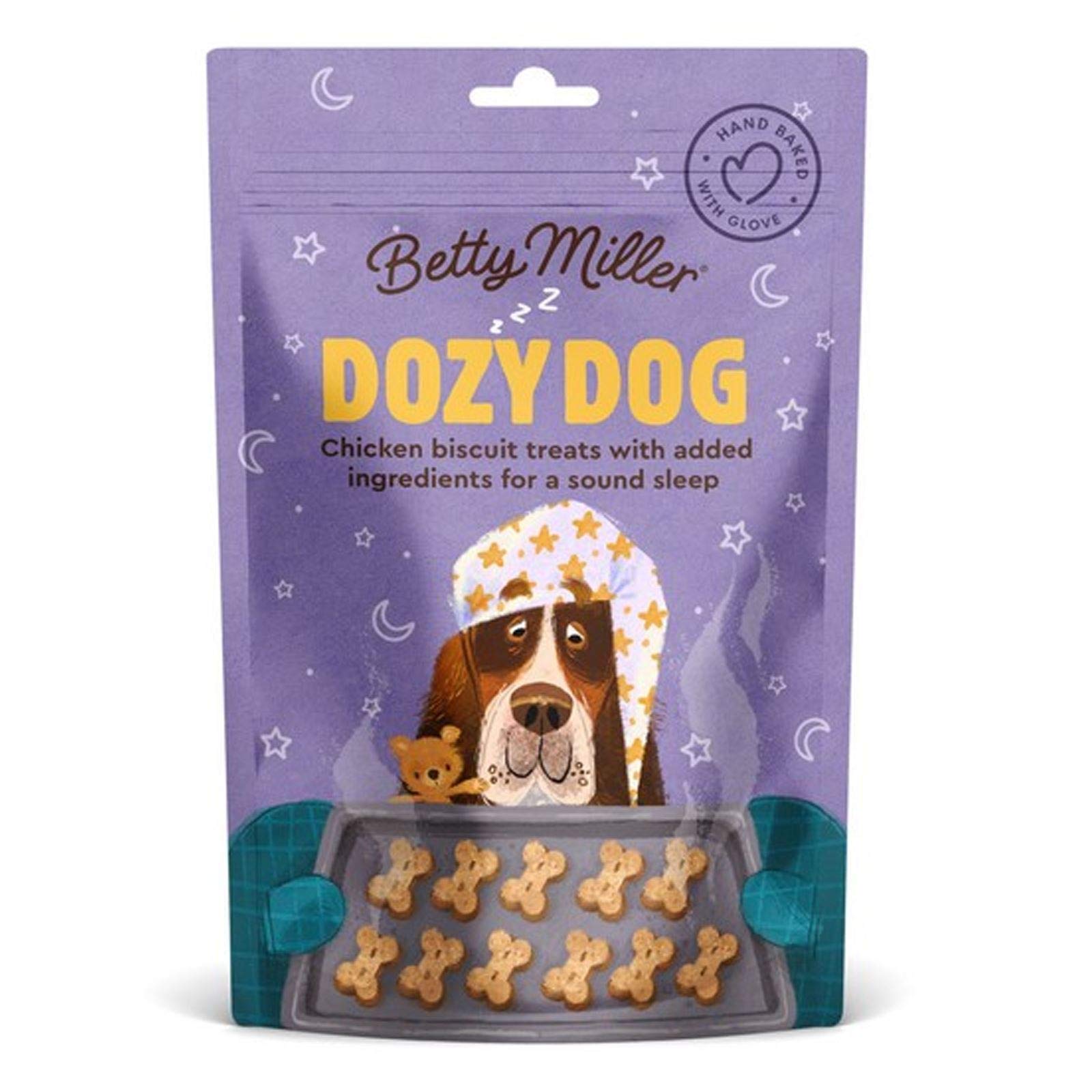 DescriptionProduct DescriptionThese Dozy Dog Treats are soft baked and grain-free for extra taste and to aid sensitive tummies. Betty's blend of herbs can help to settle your dog at night or during times of increased anxiety.Directionsstore in a cool dry place