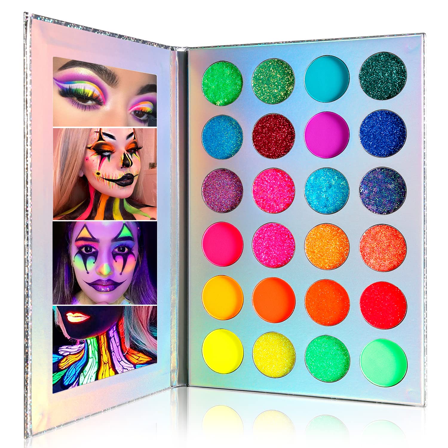 BEUSELF Neon Eyeshadow Palette, 24 Colors Highly Pigmented Fluorescent Makeup Pallet Glow in the Dark, UV Glow Blacklight Matte Glitter Rainbow Eye Shadows for Luminous Carnival Party Halloween Makeup