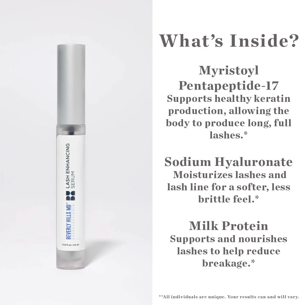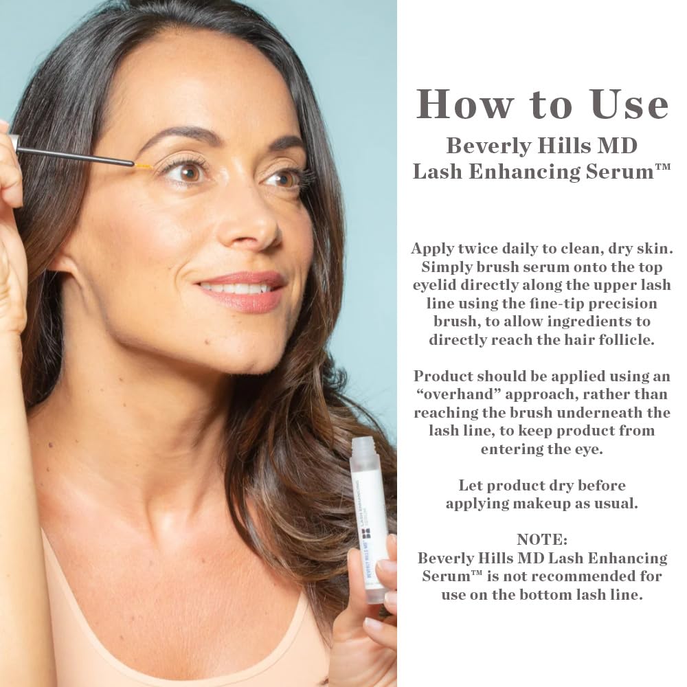 Beverly Hills MD Lash Enhancing Serum is a non-prescription eyelash treatment that helps lashes grow in looking longer, thicker, denser, and darker. The secret is our proprietary blend of natural conditioners and strengthening compounds - which safely works to support healthy hair growth and reduce fallout, for glamorous-looking lashes at any age.*