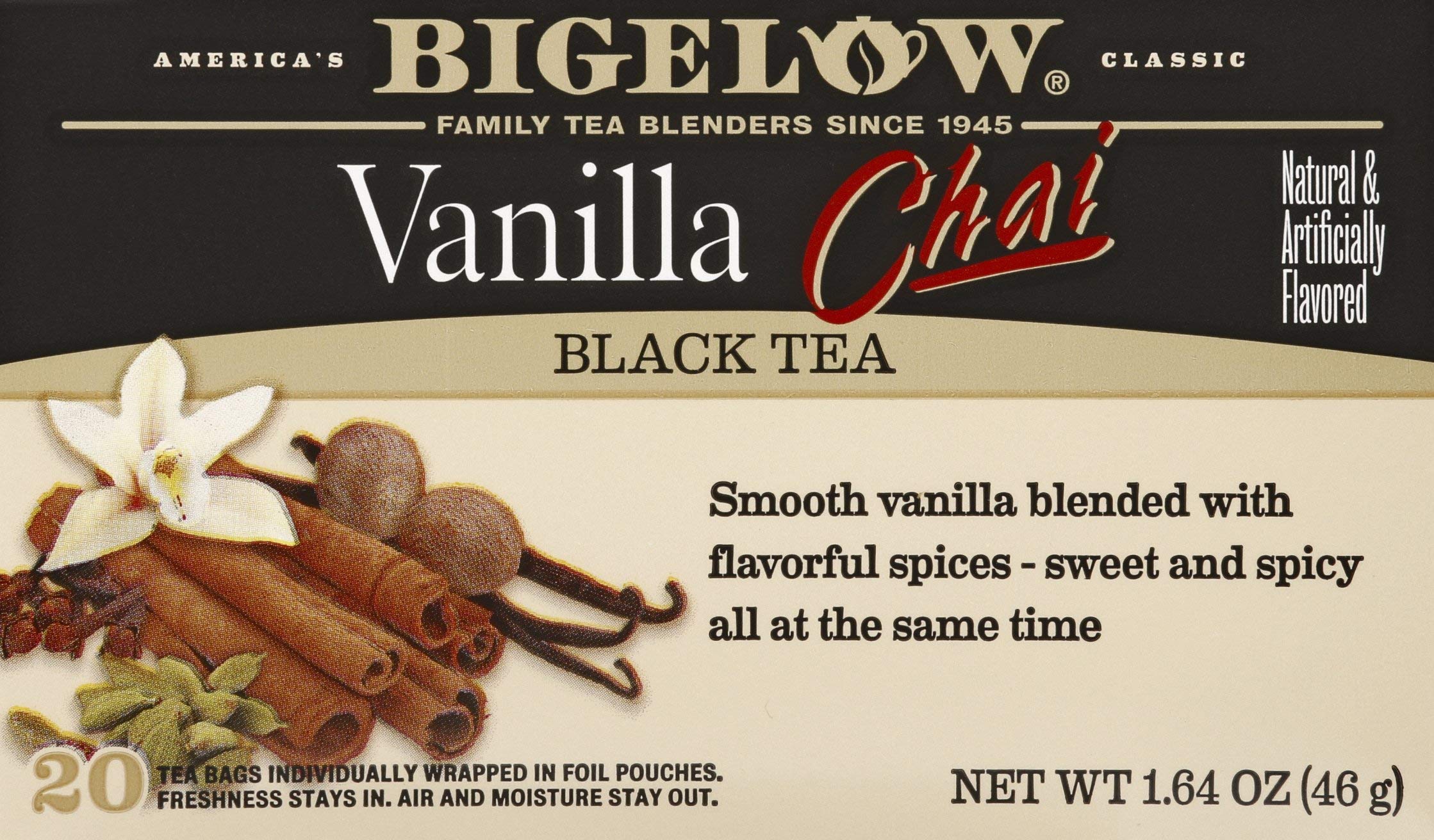Product DescriptionNaturally and artificially flavored. An exotic chai tea with a blend of vanilla flavor and spices. Take your favorite tea wherever you go. Each tea bag individually wrapped to ensure your full enjoyment. Chai is a delightful blend of tea and exotic spices. It is often brewed with milk, which gives chai a wonderful, creamy characteristic. In bigelow vanilla chai, we have added vanilla, offering you a whole new dimension in chai. To enjoy the authentic chai experience, just open up our stay fresh foil packet, brew a cup, add milk, sweetener or honey to bring out the flavor of the spice. For a moment you might just feel like a maharaja or a maharini. Bigelow vanilla chai-a sure way to please your senses and enchant your taste buds. Blended and packed in the usa.IngredientsIngredients: Black tea, spices, natural and artificial flavors (soy lecithin).