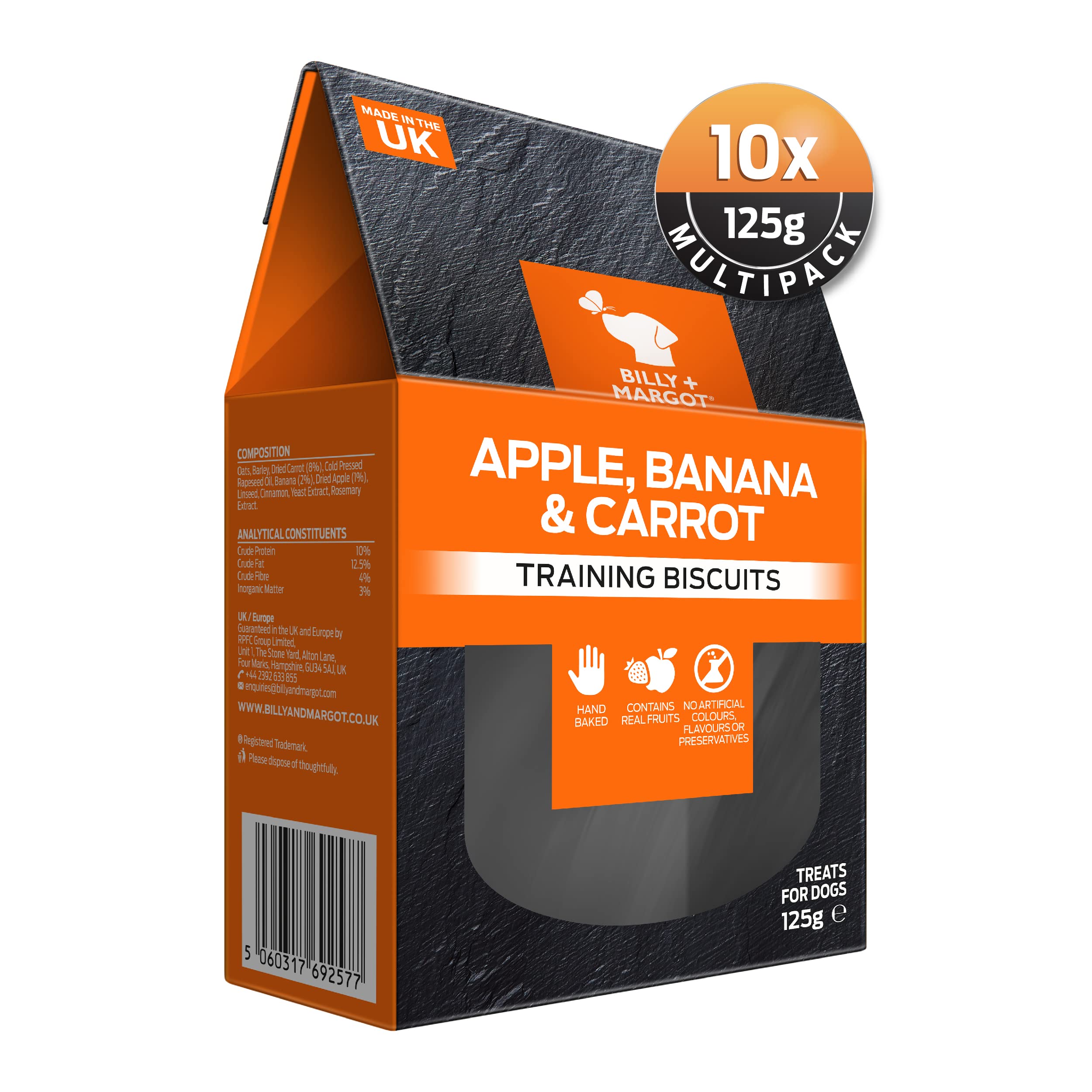 Product Description When it comes to treat time, nothing is more exciting for a dog than receiving a Billy + Margot Apple, Banana & Carrot Nutritious Training Biscuit. These delicious, bone shaped biscuits are great for training, or just as a yummy treat! Lovingly hand-prepared and oven baked these super little biscuits are made from finest ingredients sourced in Britain, and they are wheat gluten free. Dog's love the tasty flavour and crunchy texture, designed to be healthy and nutritious, they will keep your dog attentive and motivated whilst at work and play! Marie has carefully selected each ingredient for their nutritional properties: Oats - help diabetic and obese dogs to maintain stable blood sugar levels and help reduce feelings of hunger. Barley - contains soluble fibres. Linseed (Flaxseed) - is a natural source of omega-3 fatty acids that help maintain healthy joints. They are also excellent sources of lignin's. Seaweed - is naturally rich in a variety of minerals, vitamins and trace nutrients such as Iodine. Chicken Oil - when refined, is probably the best quality oil one could use in a dog food. It provides long term energy and essential fat soluble amino acids in the diet. Brewer's Yeast - is a rich source of minerals and most B vitamins. Cinnamon - Consumed in small quantities, cinnamon can help reduce blood sugar. Make your training sessions simple and fun with our great range of treats from Billy + Margot, also available in two other great flavours; 'Honey & Banana treat size' and 'Strawberry & Apple mini treat size'. Suitable for all dog sizes. Do not feed to puppies under the age of 14 weeks old. Ingredients Oat, Barley, Carrot, Chicken Fat, Apple, Seaweed, Linseed, Banana, Yeast Extract, Cinnamon Directions Feed responsibly as part of a balanced diet as a treat or reward Box Contains 10 boxes of treats