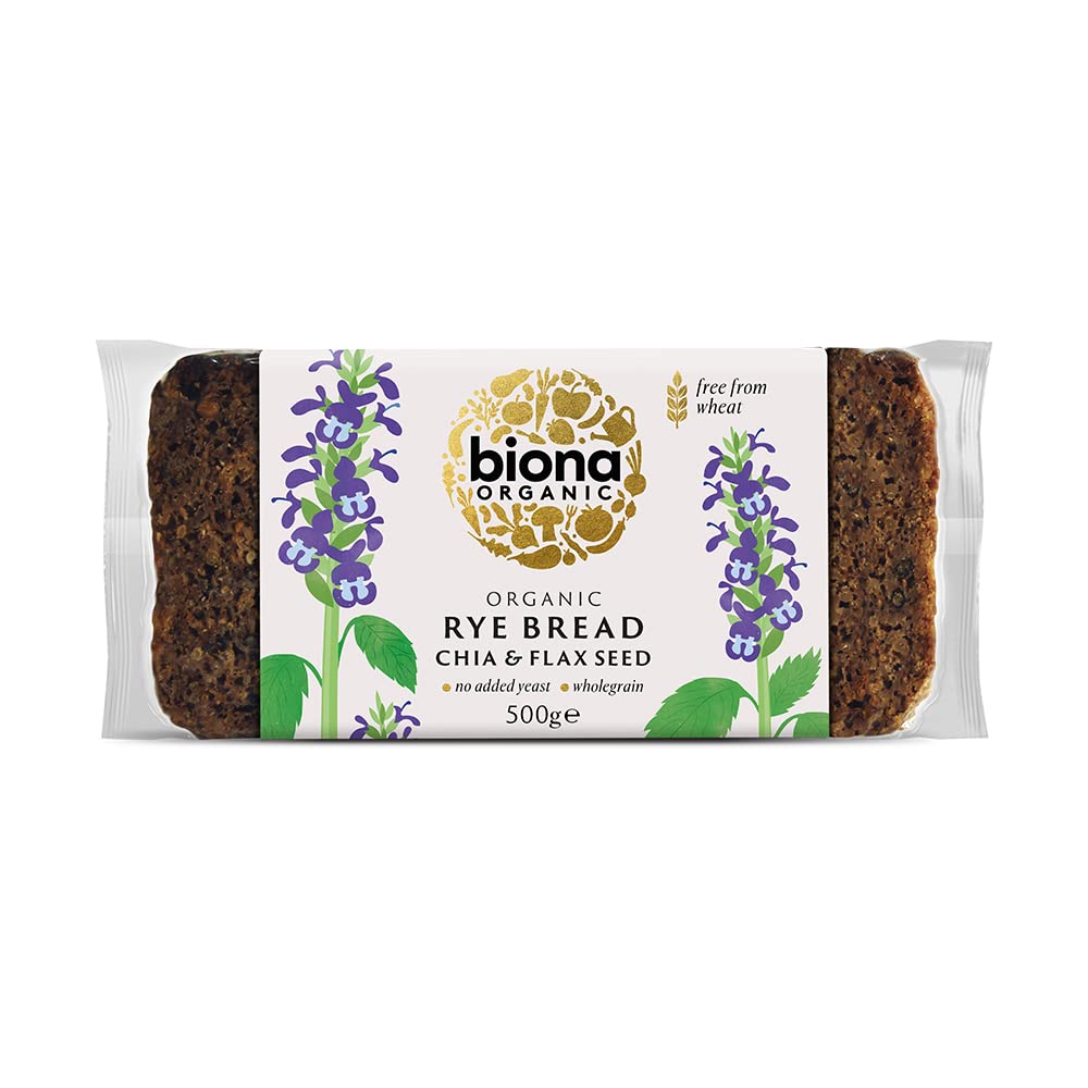 DescriptionProduct DescriptionAt biona organic, we believe in great tasting,thoughtfully prepared food to complement an ethical lifestyle. Our farmers don't use chemical pesticides or herbicides on crops, and they don't grow genetically modified plants. We also make sure they only use sustainable farming methods and do not work their land intensively. And because we believe in 100% traceability for all our products, we know all our ingredients are of the highest quality,completely natural and suitable for vegetarians.IngredientsWholegrain RYE Meal*, Water, Natural Sourdough* (Wholegrain RYE Meal*, Water), Flax Seeds*(5%), Chia Seeds (Salvia Hispanica)*(2.5%), Sea Salt. *= Certified OrganicIngredientsBox ContainsEach order comes with 6 x Biona Organic Rye, Chia and Flaxseed Bread 500 g
