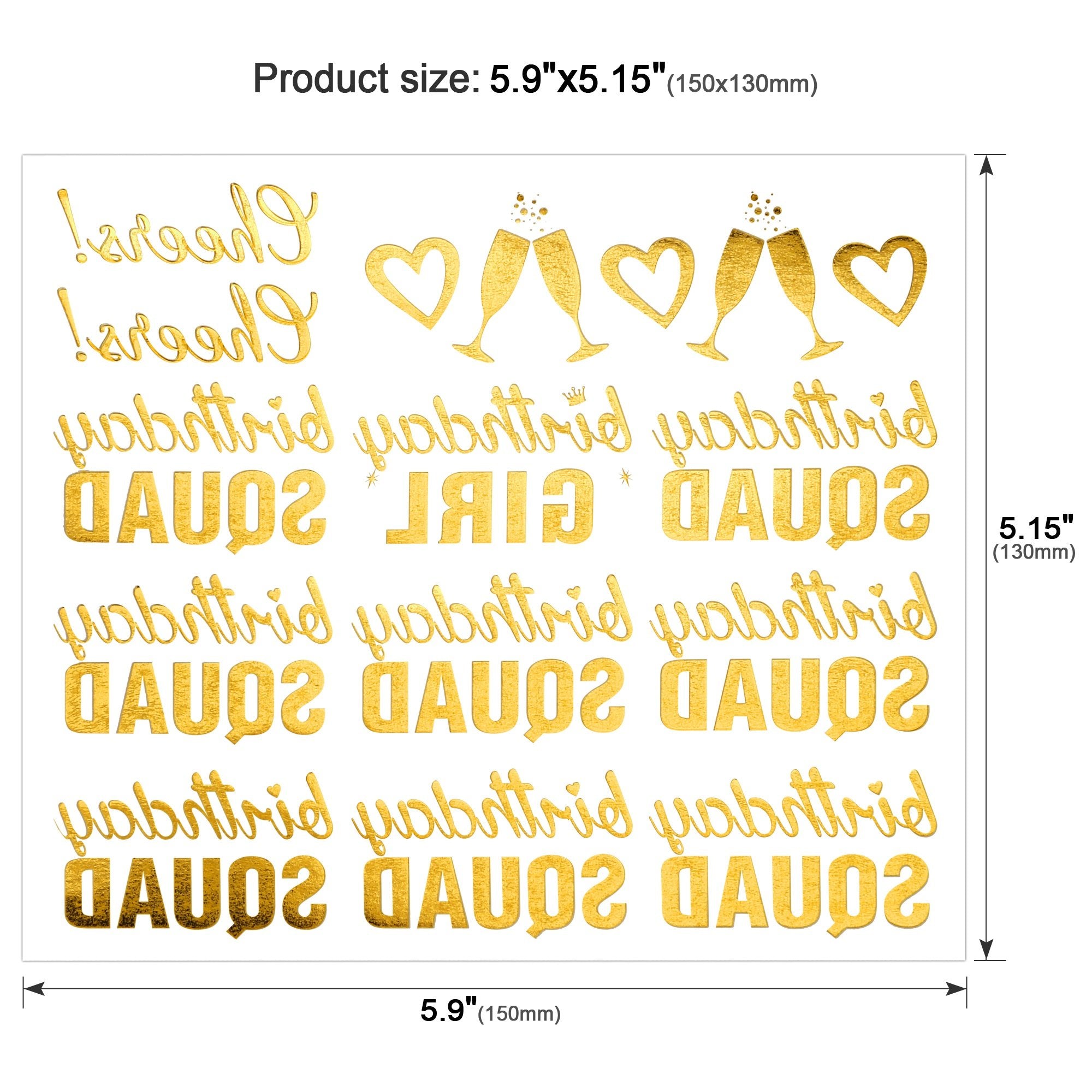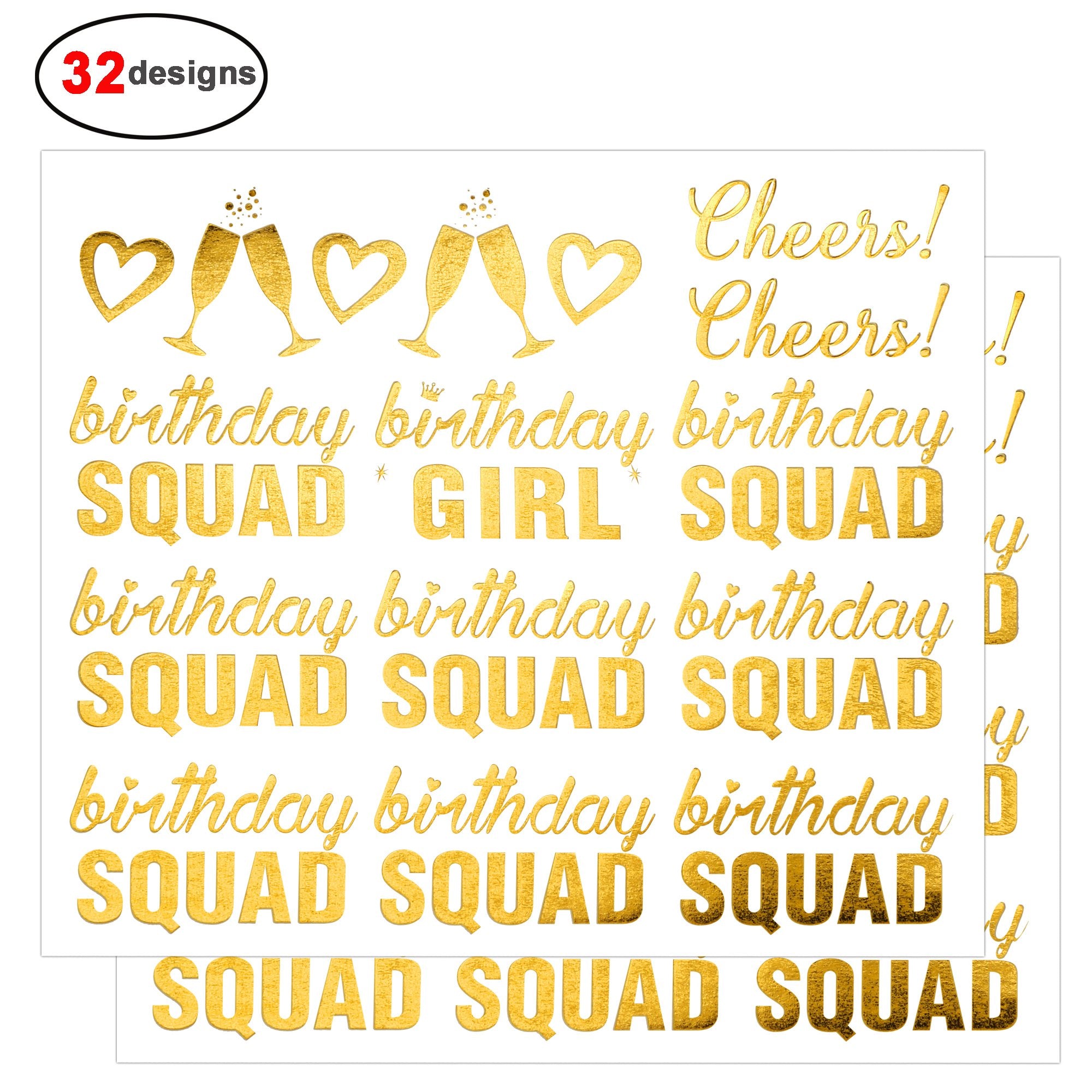 Birthday Tattoos(32Designs),Konsait Metallic Temporary Tattoos for Girls Kids Birthday Party Celebration Accessories-Birthday Girl,Birthday SQUAD,Cheers,Happy Birthday Party Bag Filler Favors Supplies