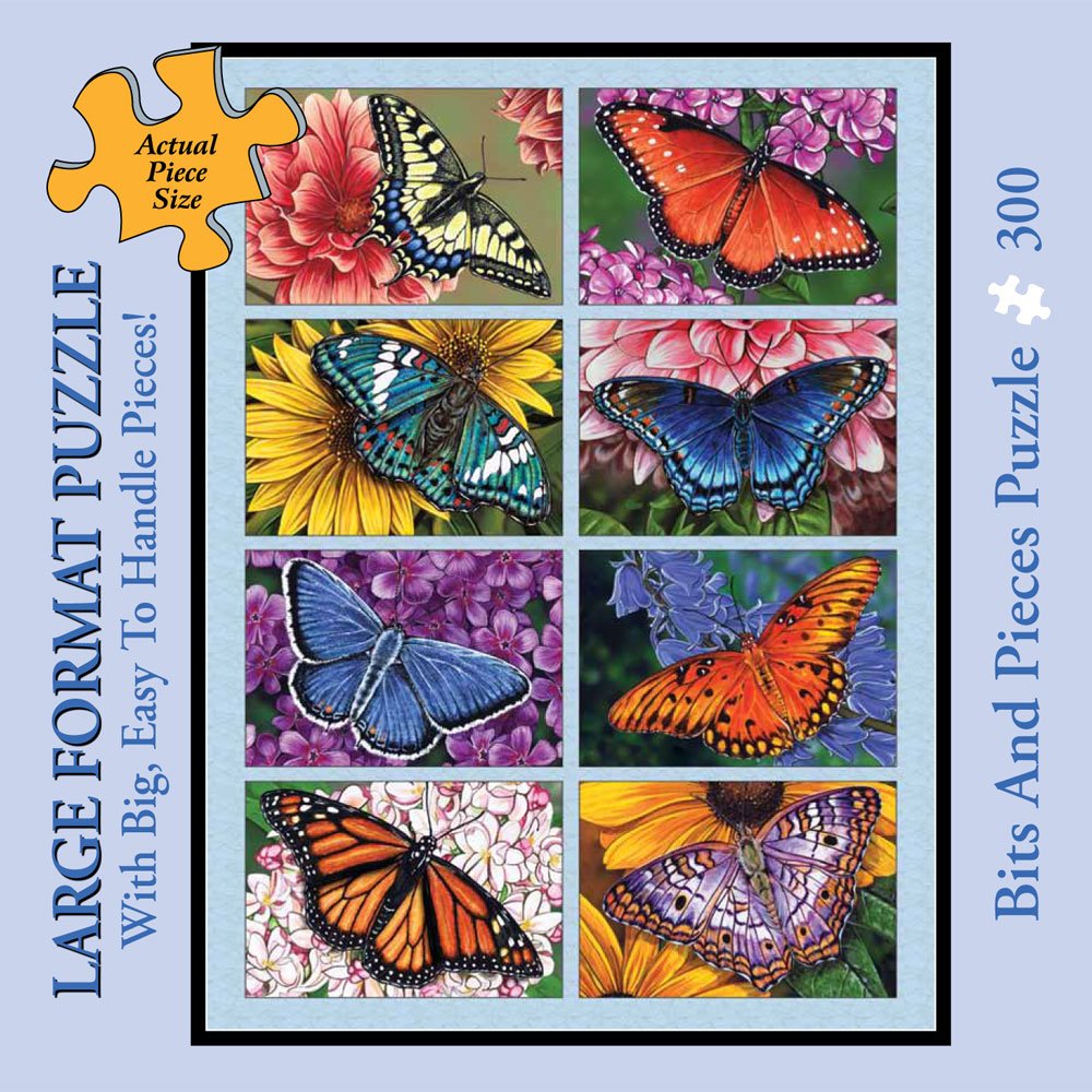 Butterflies and Blooms is a 300 Piece Jigsaw Puzzle Designed by artist Marilyn Barkhouse. This puzzle features an eight panel collage of different species of butterflies. Each butterfly sits on top of a colorful flower with its wings spread. This puzzle is 18" X 24" when completed. Since the 16th century, jigsaw puzzles have been a favorite pastime for all ages. Now, with technological advances, Bits And Pieces has taken jigsaw puzzles to a new level of superior quality and challenging fun. Every original Bits And Pieces jigsaw puzzle is made with ultra-heavy weight board and cut with quality random puzzle dies with fully interlocking pieces for a secure fit. At Bits And pieces, we believe that every truly exceptional jigsaw puzzle starts with the work of a truly exceptional artist. We understand what it takes to make a great puzzle. The kind that challenges rather than frustrates, where each area has depth and detail that unfold into a larger beauty. Bits and Pieces commissions original artwork by artists from around the world to create imaginative artwork that puzzlers like you are looking for in a wide variety of puzzle sizes and styles for any age or ability. We know every puzzler is different, so every Bits And Pieces original puzzle is manufactured in two different piece counts, ranging from 100 pieces to 2000 pieces. We also have an innovative collection of specialty puzzles including glow-in-the-dark puzzles, glitter effects puzzles, unique shaped puzzles and puzzles with oversized pieces. This 300 Piece Puzzle was created by the artist Marilyn Barkhouse.