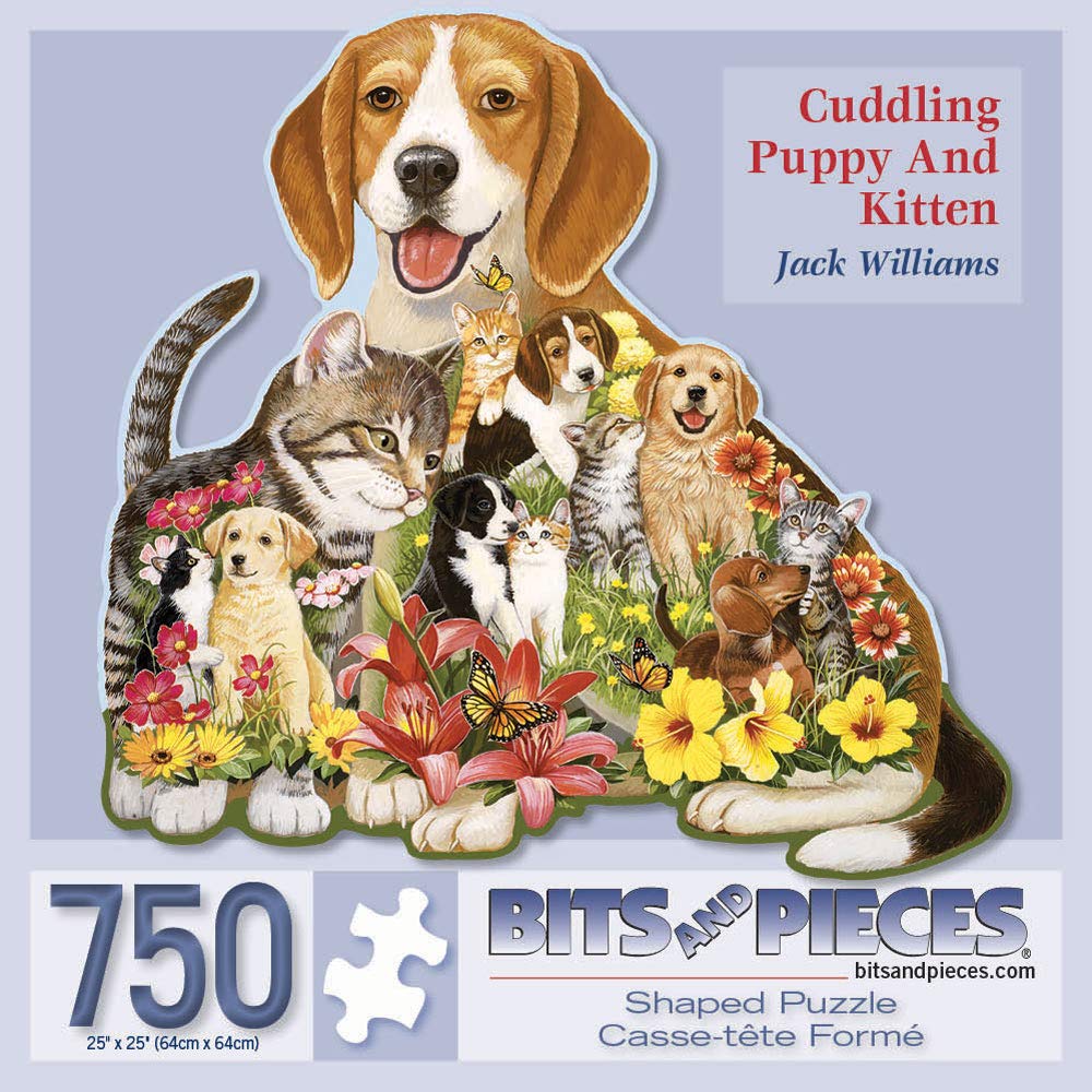 Cuddling Puppy and Kitten is a 750 piece jigsaw puzzle designed by Jack Williams. It measures when completed. Since the 16th century, jigsaw puzzles have been a favorite pastime for all ages. Now, with technological advances, Bits And Pieces has taken jigsaw puzzles to a new level of superior quality and challenging fun. Every original Bits And Pieces jigsaw puzzle is made with ultra-heavy weight board and cut with quality random puzzle dies with fully interlocking pieces for a secure fit. At Bits And pieces, we believe that every truly exceptional jigsaw puzzle starts with the work of a truly exceptional artist. We understand what it takes to make a great puzzle. The kind that challenges rather than frustrates, where each area has depth and detail that unfold into a larger beauty. Bits and Pieces commissions original artwork by artists from around the world to create imaginative artwork that puzzlers like you are looking for in a wide variety of puzzle sizes and styles for any age or ability. We know every puzzler is different, so every Bits And Pieces original puzzle is manufactured in two different piece counts, ranging from 100 pieces to 2000 pieces. We also have an innovative collection of specialty puzzles including glow-in-the-dark puzzles, glitter effects puzzles, unique shaped puzzles and puzzles with oversized pieces.