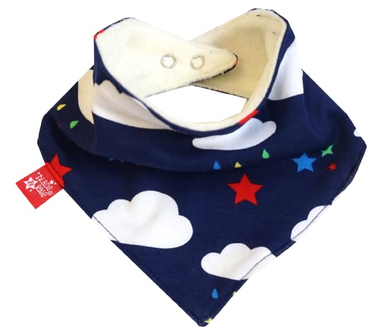 There's never a dull day when you're wearing this bib. Our bibs have 2 colourful poppers to allow you to select the right size for your child. They come with a fuzzy soft fleece lining. Composition : 100% Cotton outer, 100% Polyester lining. Colour: Blue/White/Red