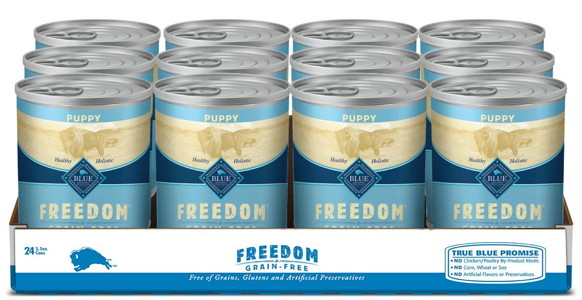 Product DescriptionIf your puppy doesn’t do well with grains, switch to BLUE Freedom grain free wet dog food. Made from the finest natural ingredients enhanced with vitamins and minerals, this mouthwatering recipe starts with high-quality chicken and contains healthy fruits and vegetables. Plus, unlike many other wet dog foods, it’s made without wheat as a thickener. Formulated with DHA, an important fatty acid, this healthy, grain free wet dog food will help support your puppy’s brain and eye development.From the ManufacturerBLUE Freedom canned food for puppies is made with the finest natural ingredients-ingredients chosen with great care by our animal nutritionists to support your puppy’s growth and development. Starts with delicious, protein-rich Chicken, Whole carrots, sweet potatoes, peas, blueberries and cranberries. NO chicken or poultry by-product meals, corn, wheat, soy and nothing artificial
