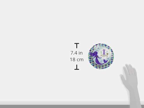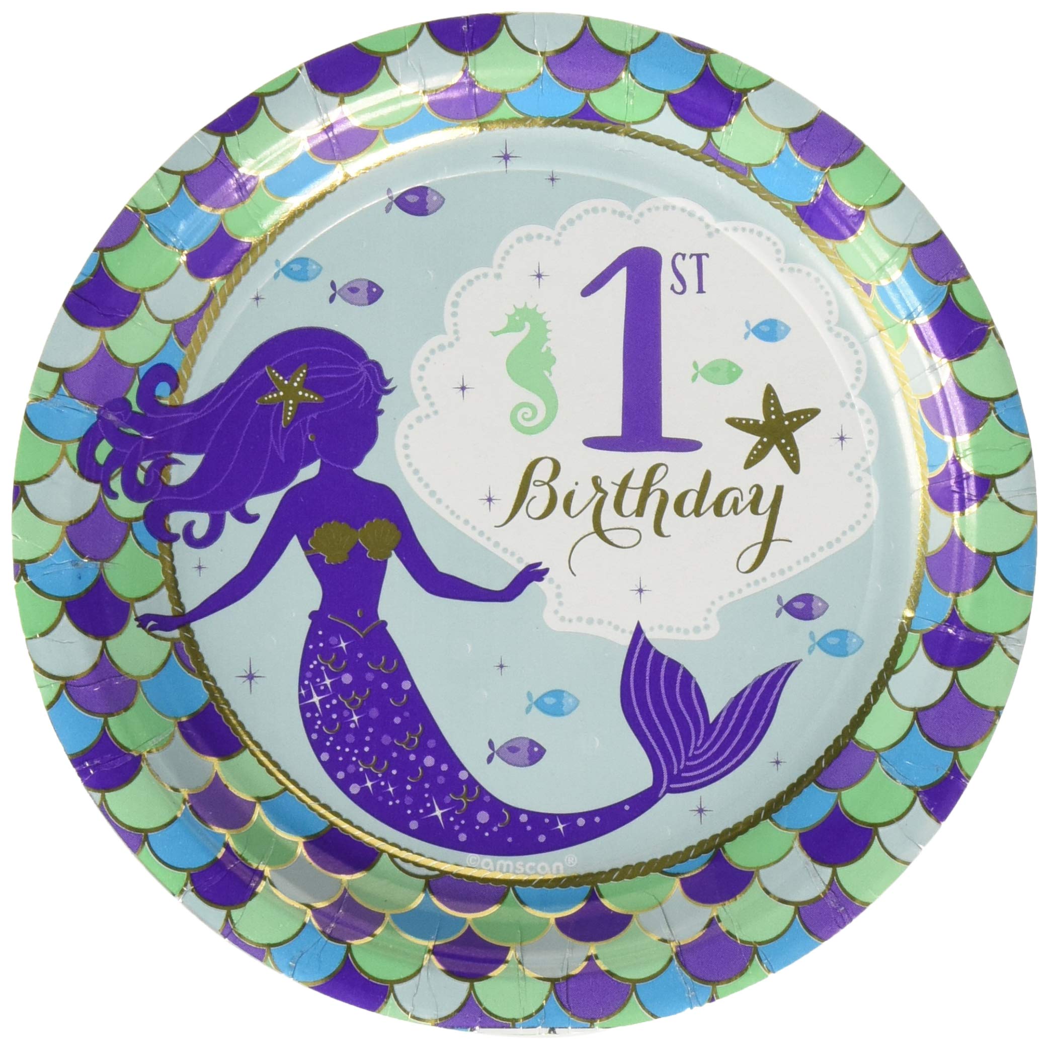 Invite your guests to your table to fill up their My First Mermaid Metallic Round Plates with your sumptuous meal. It is a green plate with colorful scaly border, featuring a violet mermaid plus a white shell w/ headline of "1st birthday"
