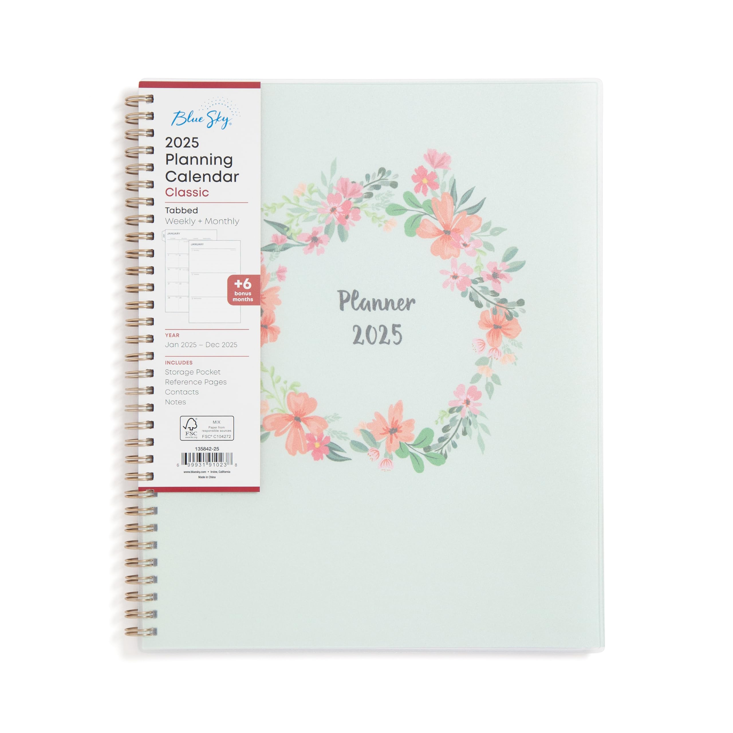 Plan your year in style with the beautiful florals and soothing colors of the 2025 calendar year Laurel collection. This stylish weekly and monthly planner will keep you organized everywhere you go. Simple page designs add a touch of sophistication and offer plenty of room for all of your important information. Designed with practicality and ease of use in mind, this floral agenda's monthly calendar tabs allow for easy access to each month’s plans while weekly views offer ample writing space for detailing each day. High quality white paper provides clean writing space for jotting down your appointments, to-dos and reminders. Use this dated planner to keep track of your appointments, and to write down notes and ideas in one place. Durable coated tabbed dividers are long lasting and make accessing information a breeze. Premium quality covers and twin-wire binding provide reliable durability for daily use. Stay on track throughout the year with this 8.5” x 11” planner dated January 2025 - December 2025. Mix and match with other Laurel Collection planning products from Blue Sky to organize your daily life. Blue Sky creates modern and sophisticated organizational planners and calendars to fit the scheduling needs of busy people - whether it’s for business professionals, college students, teachers, or anyone with appointments to make note of. Keep your life organized with our full line of products including desk pad calendars, wirebound tabbed weekly and monthly planners with contacts and notes pages to accommodate your scheduling needs, and laminated two-sided wall calendars, all in a variety of colors and patterns to suit your lifestyle and personality.
