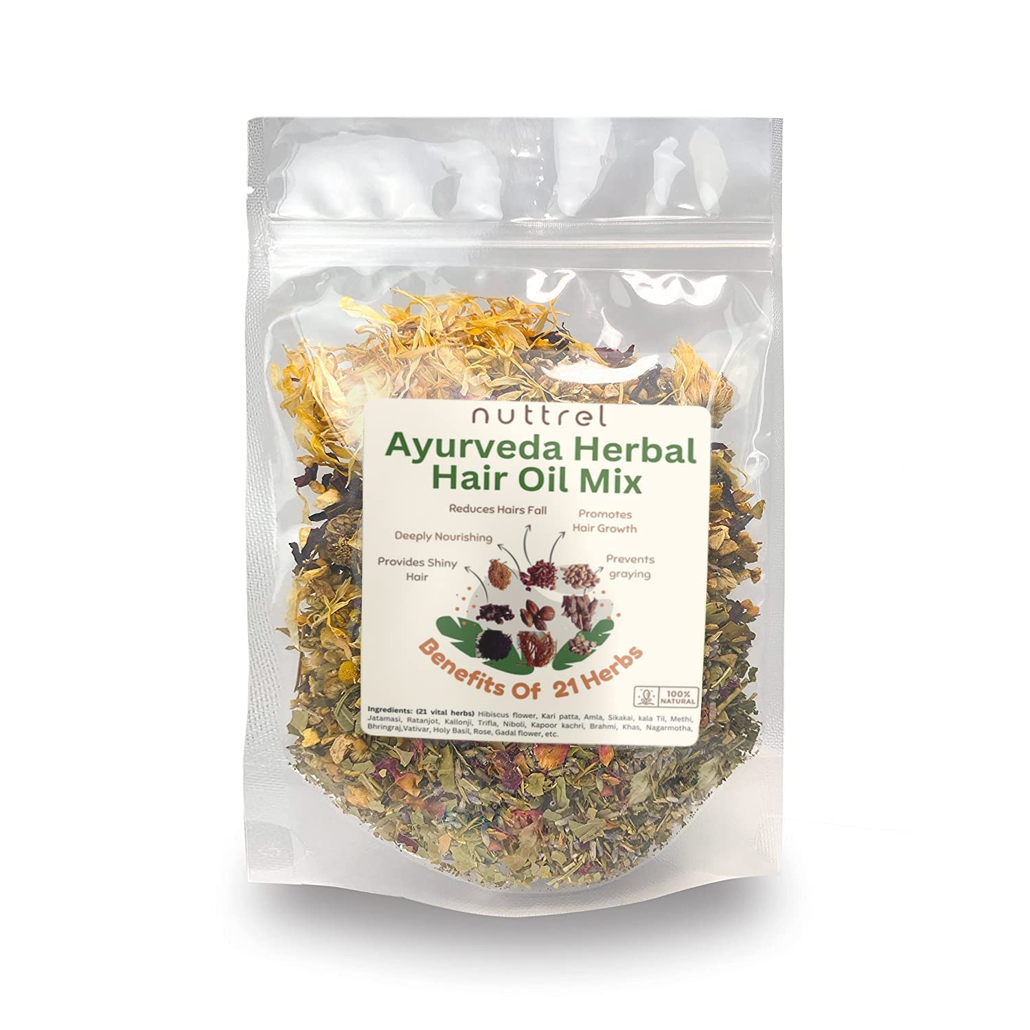 BlueQueen Herbal Hair Oil Mix of 21 Herbs for Thick Long Hair Growth 30 grams, Hairfall, Hair Repair, Scalp Care, Haircare Products Both for Men & Women - 1.01 Floz Nuttrel Natural Herbal Hair Oil Mix (3.52 Ounce Per Pack) (jadi boti) - Premium Pack: INGREDIENTS: (Common and Hindi Name) - 1. Vetiver - Khus Khus (Usheera). 2. Champaca seed - Champak 3. Fenugreek - Methi 4. Marorphal - Valampiri 5. Idampuri 6. Poolankilangu - Chandramoolika 7. Curry Leaves - Kari pattu 8. Ranawara - Tarwar 9. Hibiscus - Japa 10. Vembalam Bark plus 8 vital herbs for hair care. USES AND BENEFITS: 1. Prevents hair fall. 2. Prevents gray hair. 3. Prevents dandruff. 4. Reduces body heat. 5. Regular use gives thick and long hair. MAKE YOUR OWN HERBAL HAIR OIL IN JUST 3 SIMPLE STEPS: STEP 1: Open the pack and put the herb mix in a container. STEP 2: Fill the container with 1 Ltr (33 Oz) of coconut oil or any preferred essential oil. Make sure the herbs get completely soaked in the oil. Leave the mixture for 5 to 6 hours. STEP 3: After 5 to 6 hours, your herbal hair oil is ready and you can start using it by straining the oil. REFILL INSTRUCTIONS: Once the oil reaches half the container, refill the container with oil. Max 2 refill is recommended. APPLICATION INSTRUCTIONS: A gentle massage after application of the herbal hair oil is recommended. The oil can be used at any time but using it in the night and washing in the morning is suggested. Regular usage for 2-3 months gives amazing results. No restrictions, any age can use the oil as it is completely natural. 100% CUSTOMER SATISFACTION IS GUARANTEED. The herbs can also be grounded and can also be used as hair packs. The oil strained from the herb mix can also be used for head massages.