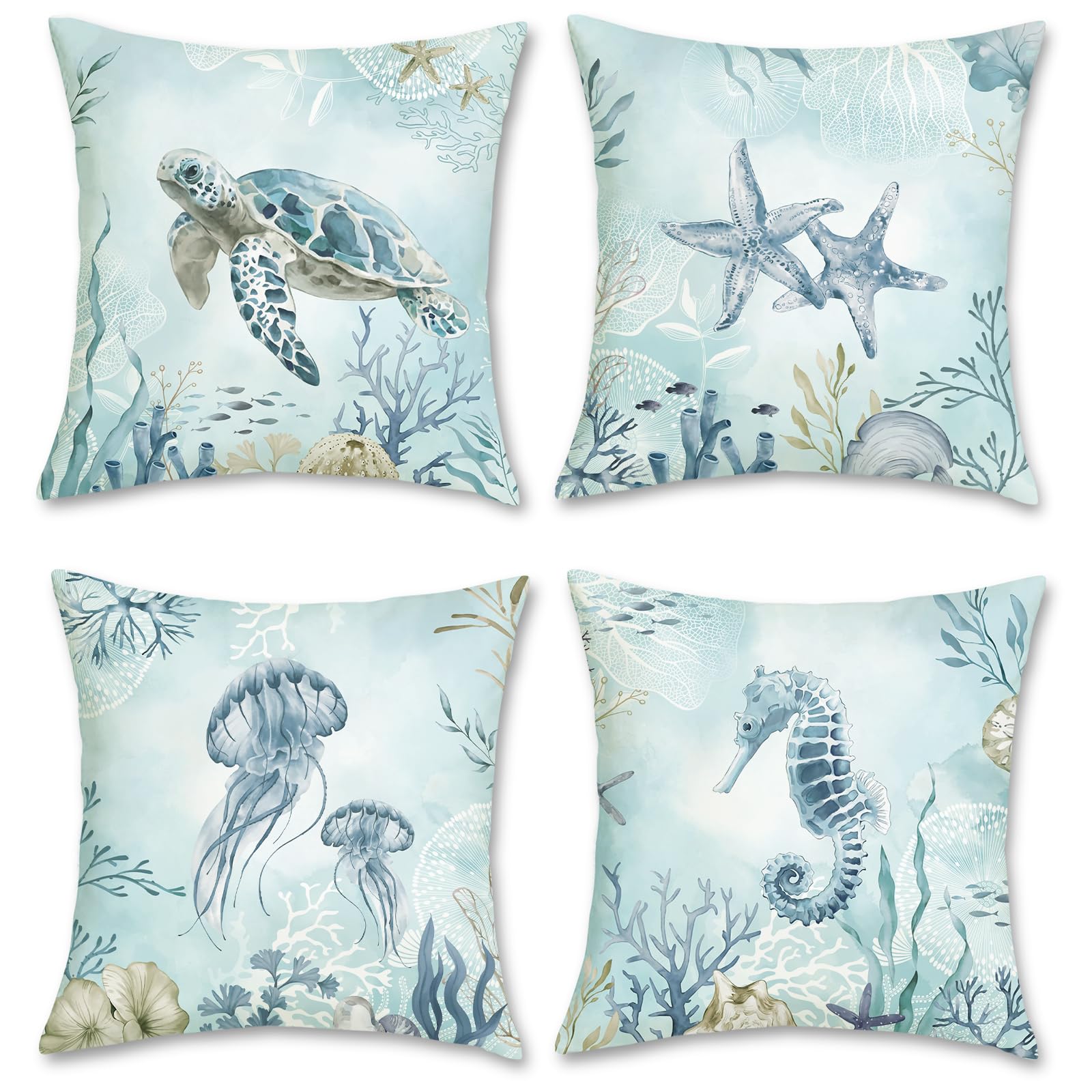 Bonhause Coastal Blue Throw Pillow Covers 18 x 18 Inch Sea Turtle Seahorse Starfish Beach Decorative Pillow Cases Ocean Cushion Covers for Sofa Bed Home Decor Set of 4