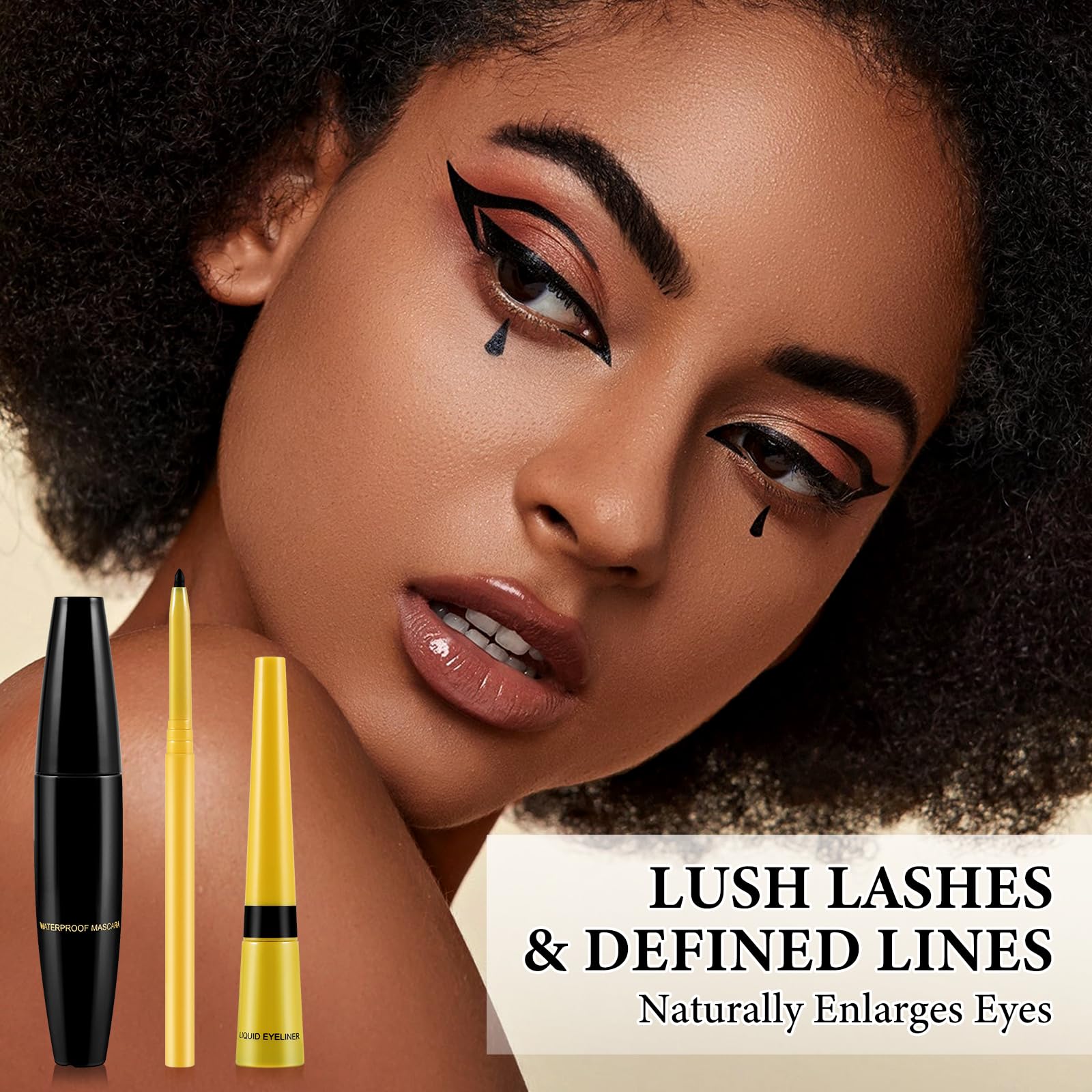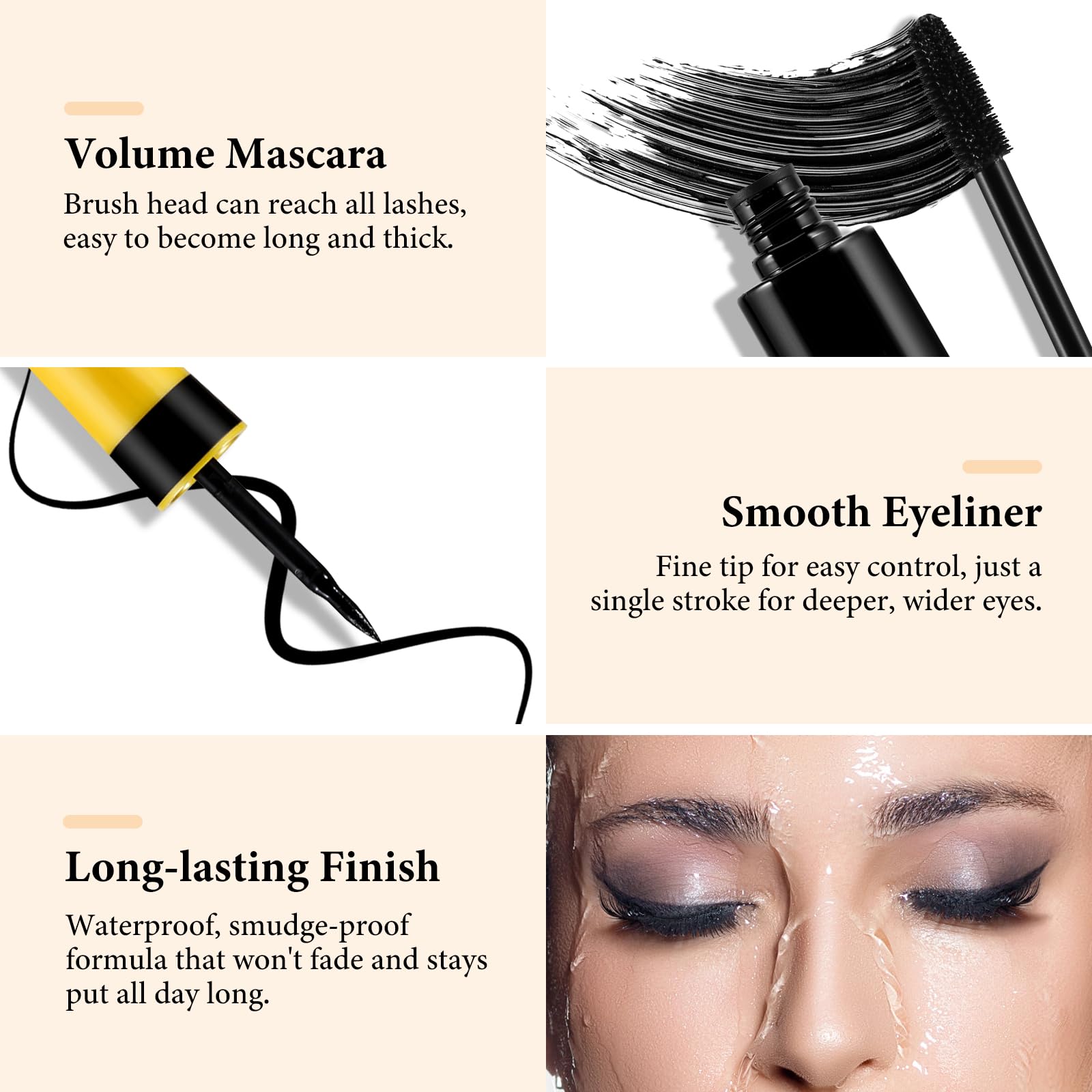 Boobeen 4D Silk Fiber Mascara & Eyeliner Pen, Long Lasting Waterproof Mascara and Eye Liner set, Volume and Length Mascara to Enlarge Eyes, Smudge-Proof Liquid Eyeliner for Eye Makeup