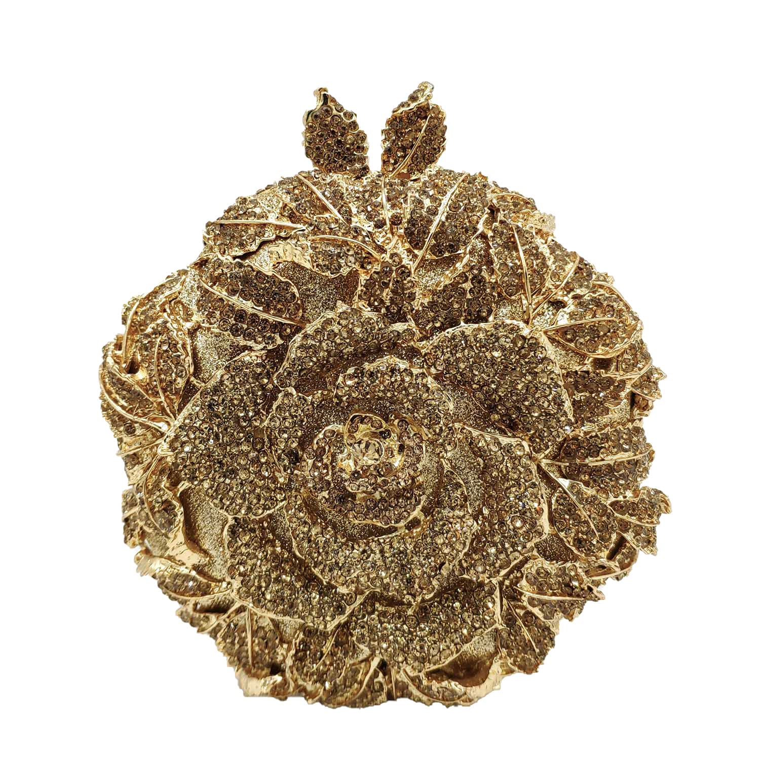 Boutique De FGG Round Shape Rose Flower Crystal Clutch Purses for Women Formal Evening Bags Wedding Party Handbags (Small,Gold)
