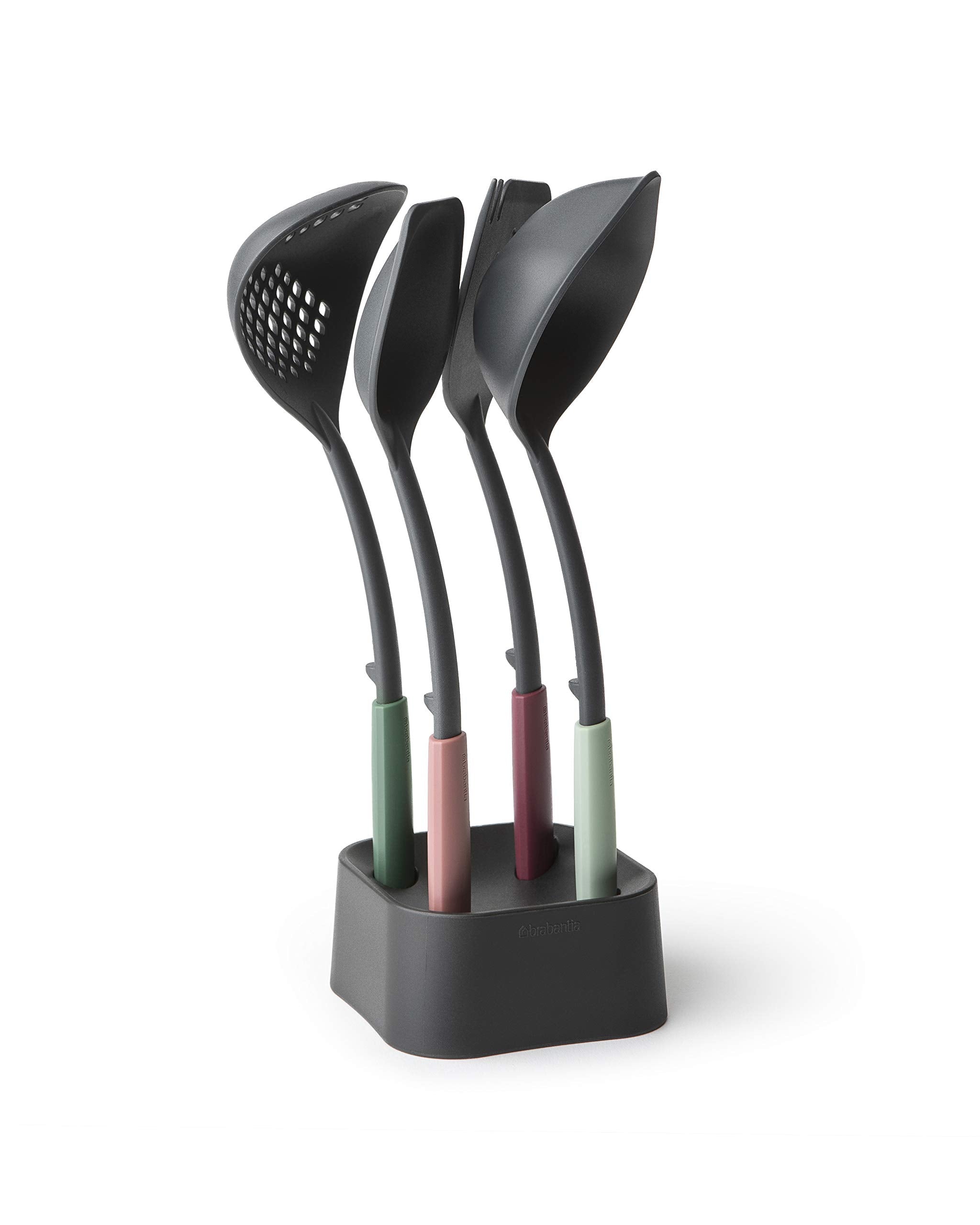 Keep your favourite kitchen tools handy with this smart set of 4 two-in-one kitchen essentials. Stand with a Soup Ladle plus Scraper Tool, a Serving Spoon plus Spatula, a Skimmer plus Ladle, and a Spatula plus Fork.