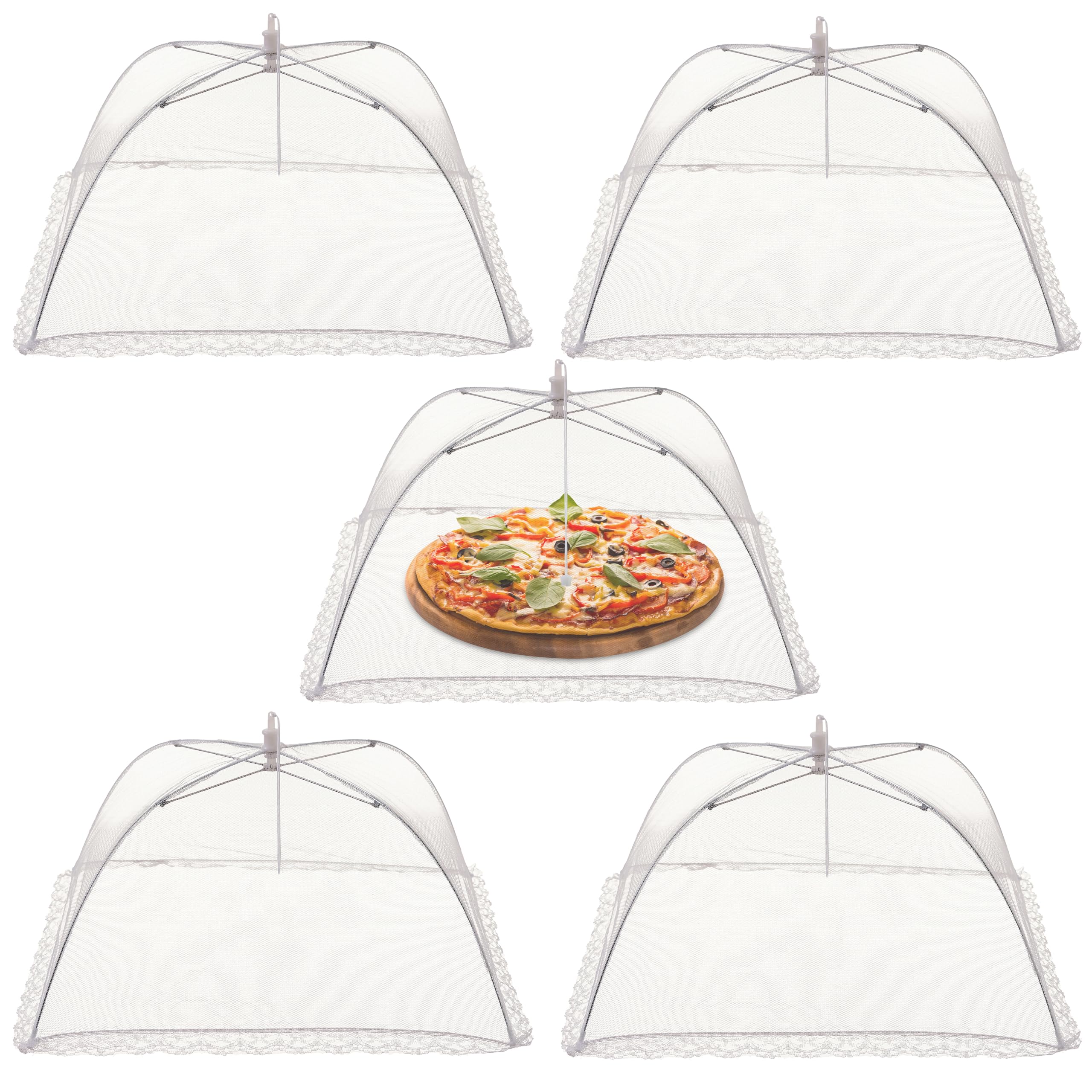Introducing the ultimate solution to keep your outdoor dining experience enjoyable and insect-free! Our premium food cover tents are your best companion for garden parties, barbecues, and picnics. Designed with elegance and functionality in mind, each pack includes 5 lightweight tents made from high-quality, tightly woven mesh supported by a sturdy steel frame, ensuring durability and reliability. Measuring 42x42x22 cm each, they provide ample coverage for an array of dishes. The user-friendly design allows for effortless opening and collapsing with just one hand, making them as convenient to use as they are effective. The charming lace finish and decorative band around the bottom ensure that these covers don't just protect your food, but also add a touch of grace to your table setting. After the fun is over, they can be easily cleaned, collapsed, and stored away, ready for your next event. Say goodbye to unwelcome guests at your table and hello to stress-free entertaining with our elegant food cover tents!