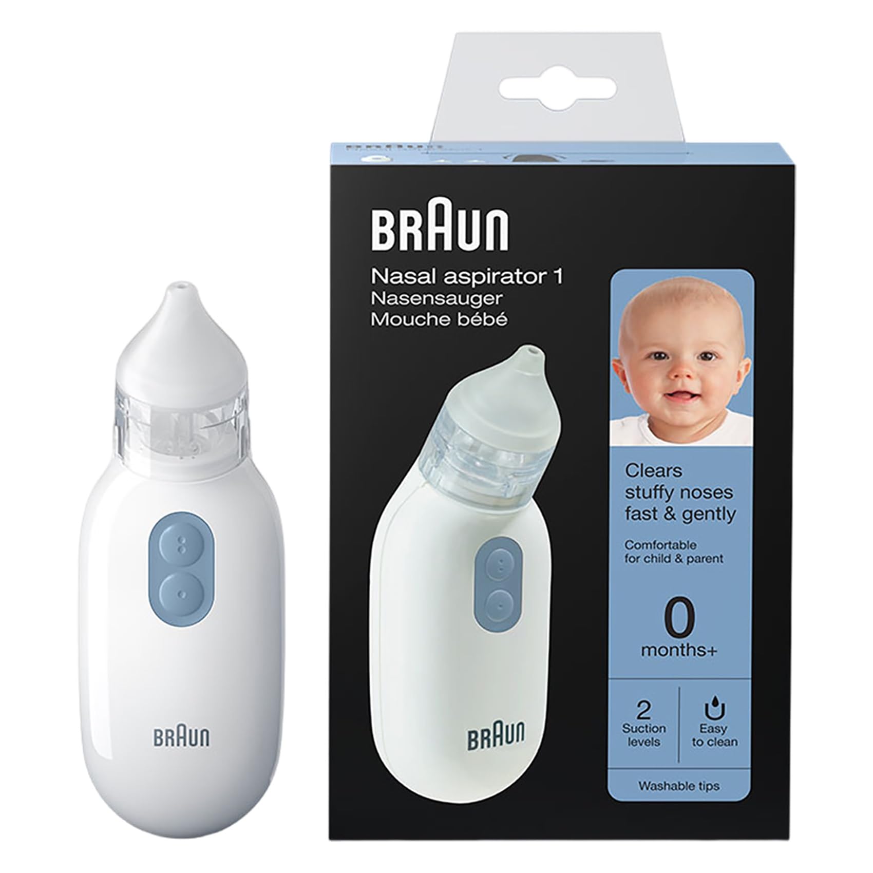 DescriptionProduct DescriptionProvide your child with quick and convenient blocked nose relief and clear their nasal congestion with the Braun Nasal aspirator 1.Suitable for the smallest of noses, including newborn babies, this battery-operated suction device means no more manual unblocking. Includes two nose tips for a personalised fit and optimal results, while two gentle nose suction levels mean you can adapt the suction strength to your little one's needs. Easy to dismantle and clean, either with soap and warm water or simply put the detachable part in the dishwasher.Safety Warningkeep away from kidsBox ContainsTwo comfortable tips, a soft carry pouch, 2x AA batteries and a quick-start guide