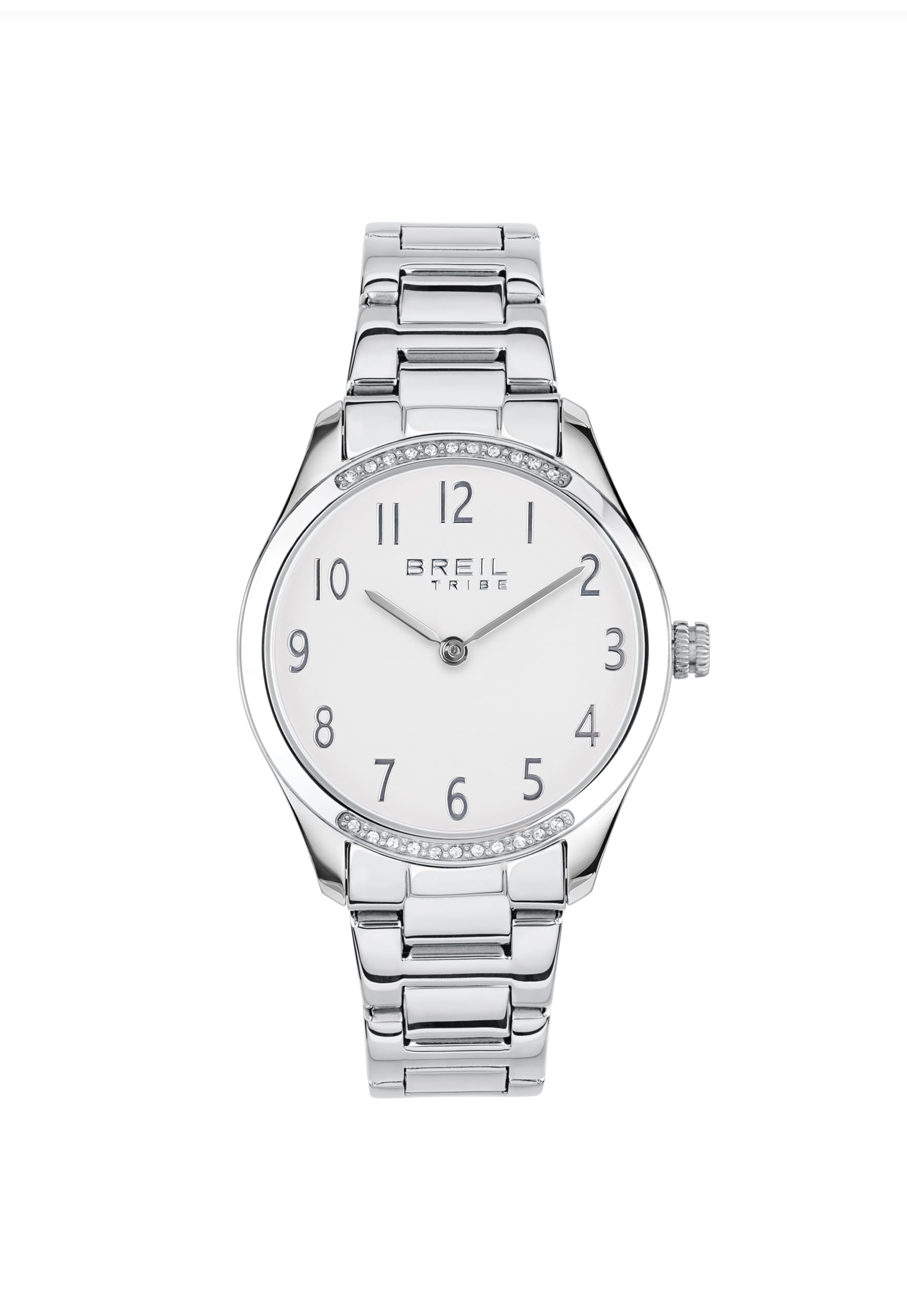 Breil Kyla EW0704 women's only time watch, white steel background with crystals. Watch with steel case with a diameter of 32 mm. Polished and satin finish stainless steel bezel in silver tone finished with white crystals. White dial with mineral glass and date display. Time-only quartz movement. Silver-tone steel bracelet, standard clasp with buttons. 50 meter water resistance. Delivered with original box and official guarantee