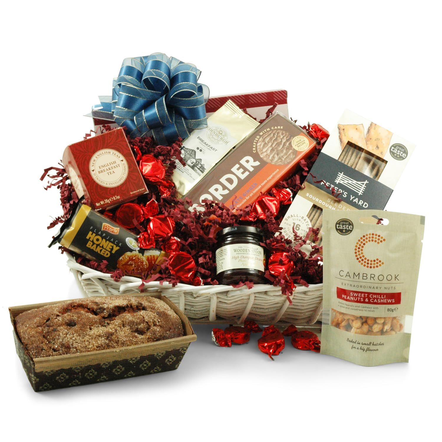 British Food Hamper - Contains Award Winning Delicacies - Handmade Wicker Basket Wrapped With Red, White & Blue Ribbon
