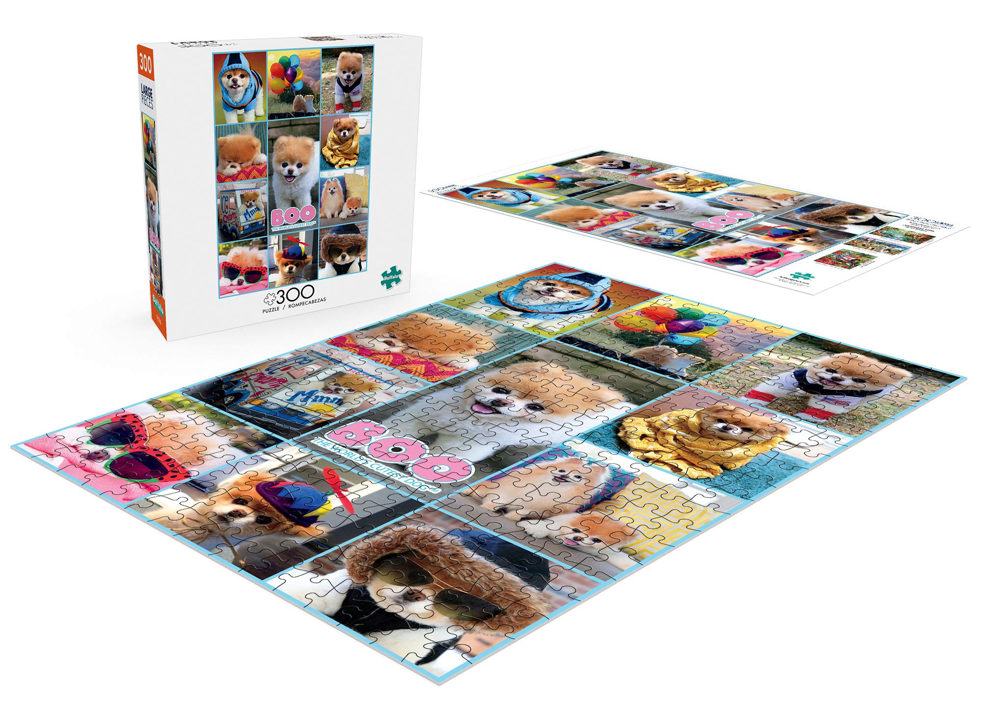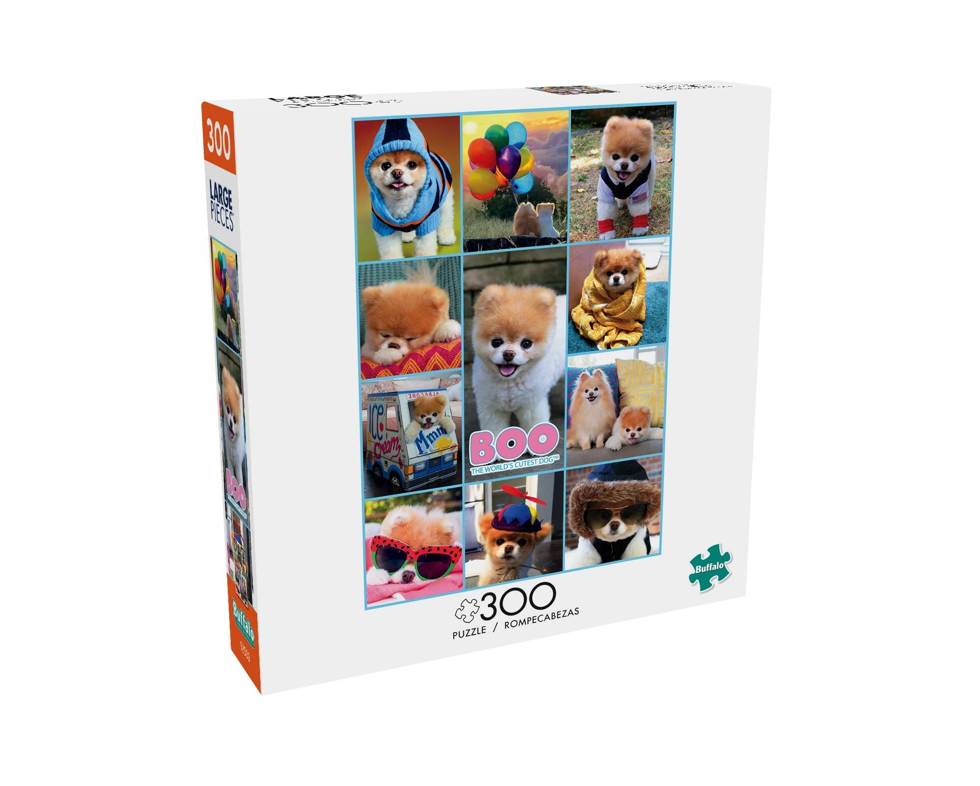 Say hello to Boo, the world’s cutest dog in this 300-piece jigsaw puzzle, Boo Collage, by Buffalo Games. This puzzle feature a collage of some of Boo’s cutest photos from drying off after bath time to driving an ice cream truck! Hats, sunglasses, and hoodies, this lovable Pomeranian puppy has it all! Every Buffalo Games jigsaw puzzle is manufactured from recycled puzzle board. s signature Perfect Snap™. A bonus puzzle poster is also included so that you have a handy reference of what the completed puzzle should look like while you put yours together.