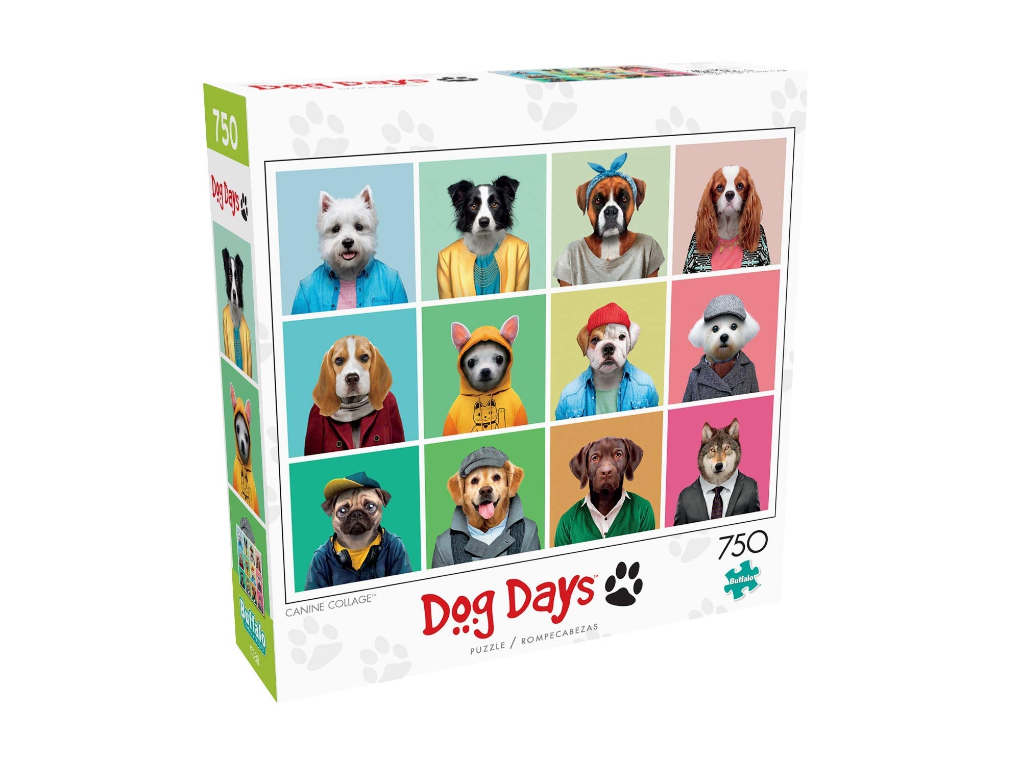 This 750-piece jigsaw puzzle from the Dog Days series by Buffalo Games is titled Canine Collage. This canine collage puzzle pictures dogs wearing human clothes. There is a wolf in a suit, a Chihuahua in a hoodie, and a Pug wearing a baseball hat. This puzzle will surely make you smile. Every Buffalo Games jigsaw puzzle is manufactured from recycled puzzle board. s signature Perfect Snap™. A bonus puzzle poster is also included so that you have a handy reference of what the completed puzzle should look like while you put yours together.