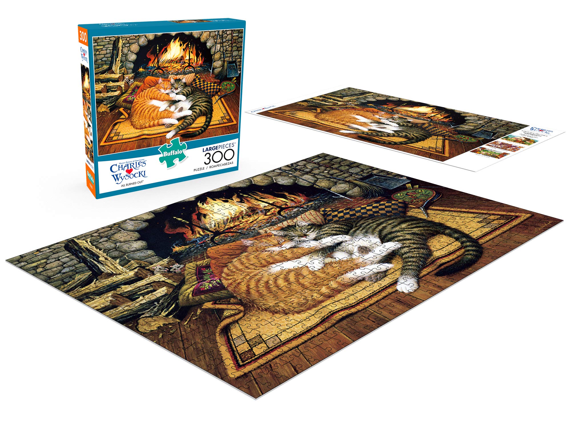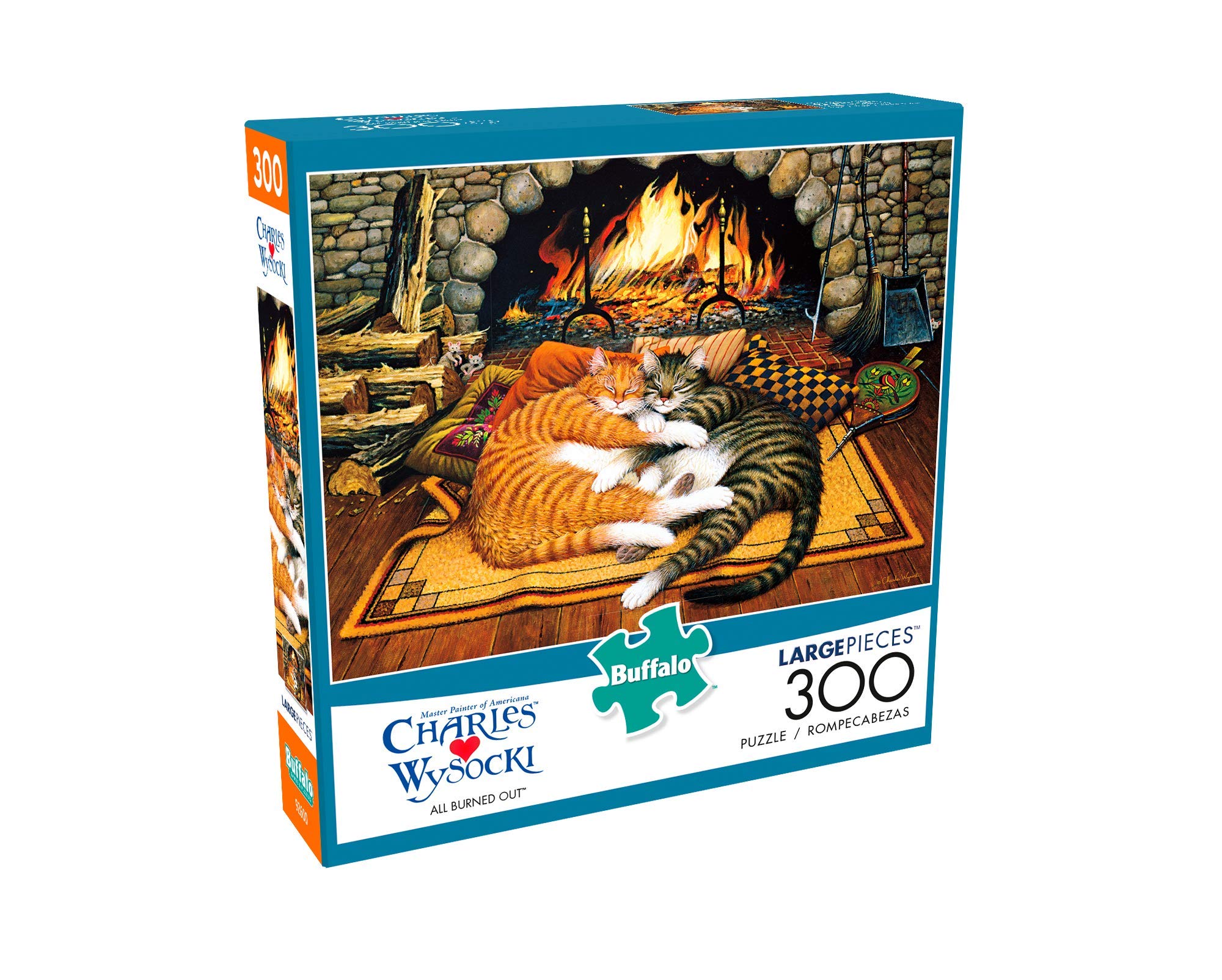 This 300 LARGE piece jigsaw Puzzle titled “All Burned Out” by Charles Wysocki finds our two feline friends lounging after a long day of chasing mice. The fire burns bright behind them in a warm oven fireplace. The cats’ fur is vibrant with hues of orange and brown. These kitties will be well rested for another full day of “work” tomorrow. For more than 40 years, Charles Wysocki enjoyed his love affair with life and Americana and through his imaginative and colorful artwork, touched the hearts of millions worldwide. "Chuck" felt a special kinship with Puzzlers, who share in the creative process by building his paintings one piece at a time. The pieces of this puzzle are 67% larger than traditional puzzle pieces, which makes them easier to see and hold for a pleasant puzzle experience. Every Buffalo Games jigsaw puzzle is manufactured using premium quality 100% recycled paperboard. A precision cutting technique guarantees that every piece will fit soundly with the company's signature Perfect Snap™. A bonus puzzle poster is also included so that you have a handy reference of what the completed puzzle should look like while you put yours together.