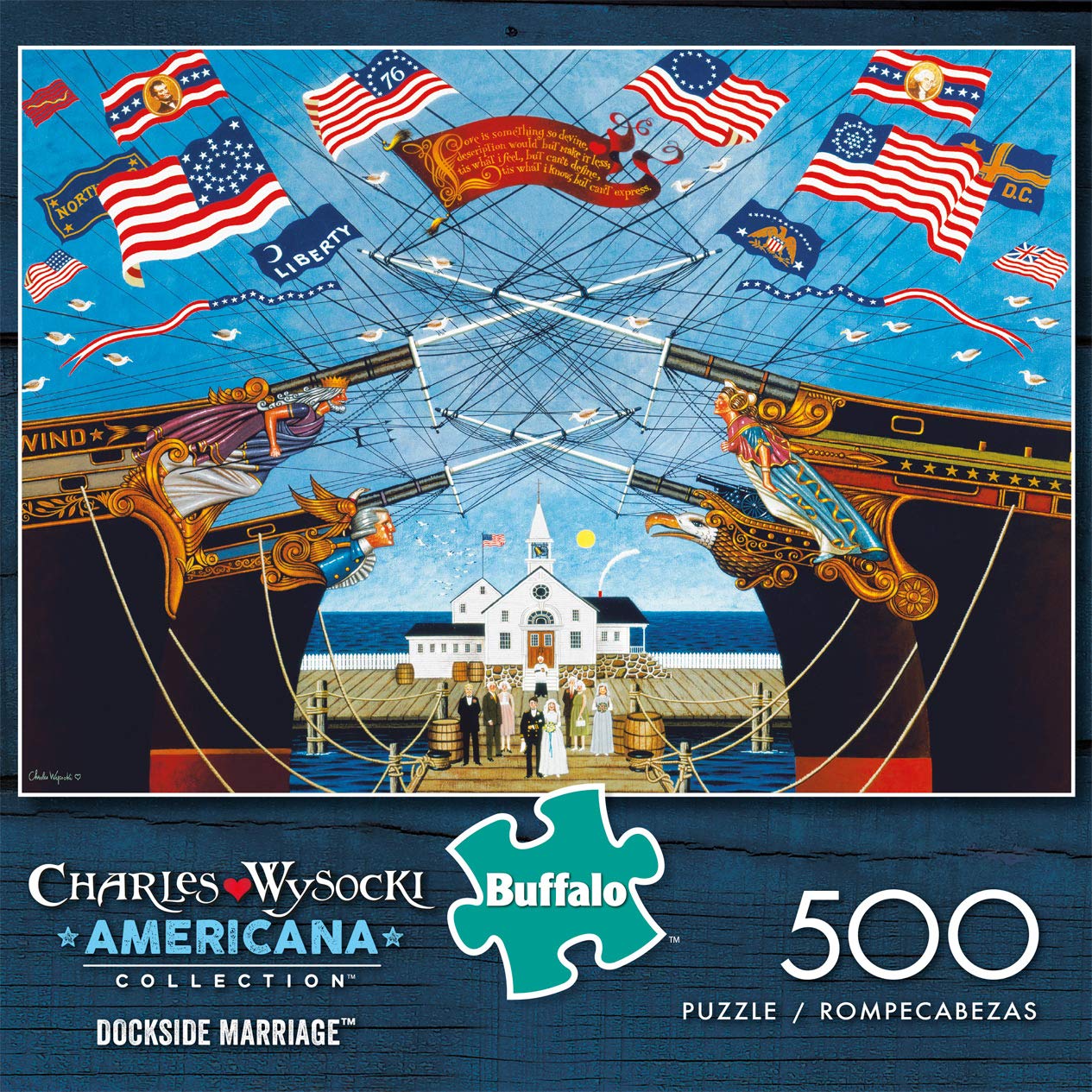 This 500-piece jigsaw puzzle, Dockside Marriage, is based on the artwork of famed painter Charles Wysocki and is a part of the Americana collection by Buffalo Games. This puzzle features a small wedding on a dock with regal ships representing early America that are creating an impressive arch overhead of the newlyweds. For more than 40 years Charles Wysocki enjoyed his love affair with life and Americana, and through his imaginative and colorful artwork, touched the hearts of millions worldwide. "Chuck" felt a special kinship with puzzlers who share in the creative process by building his paintings one piece at a time. Every Buffalo Games jigsaw puzzle is manufactured from recycled puzzle board. s signature Perfect Snap™. A bonus puzzle poster is also included so that you have a handy reference of what the completed puzzle should look like while you put yours together.