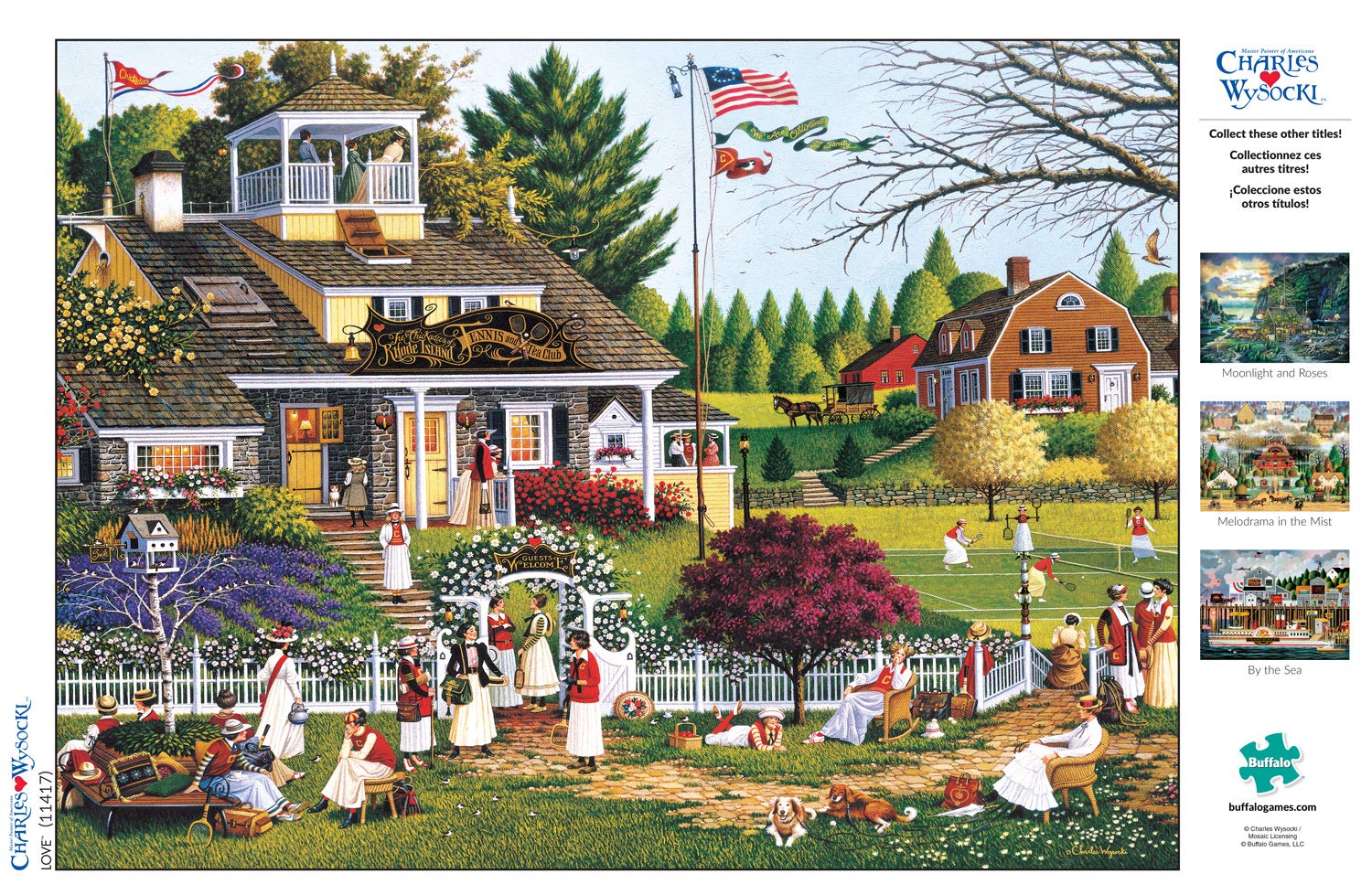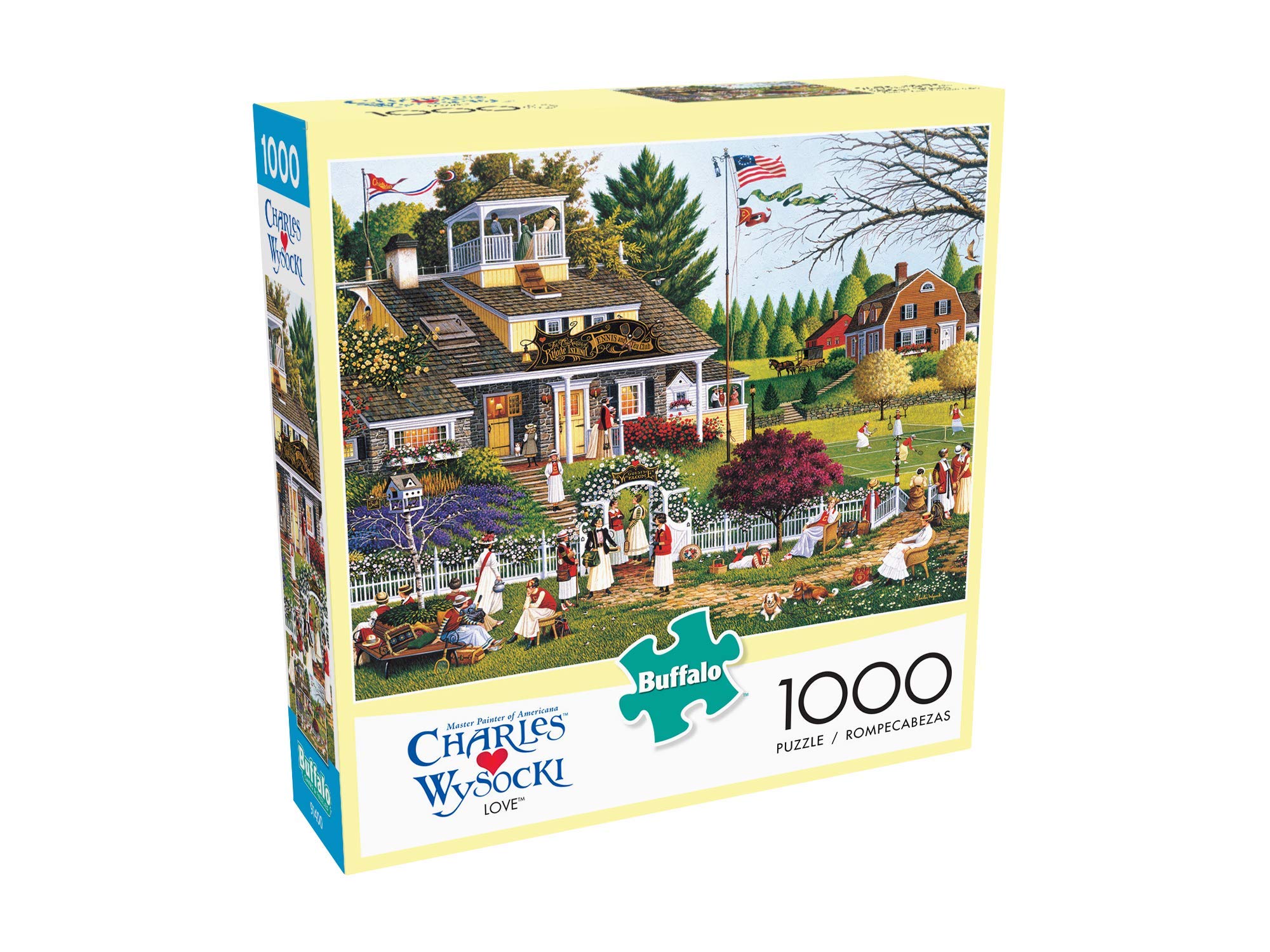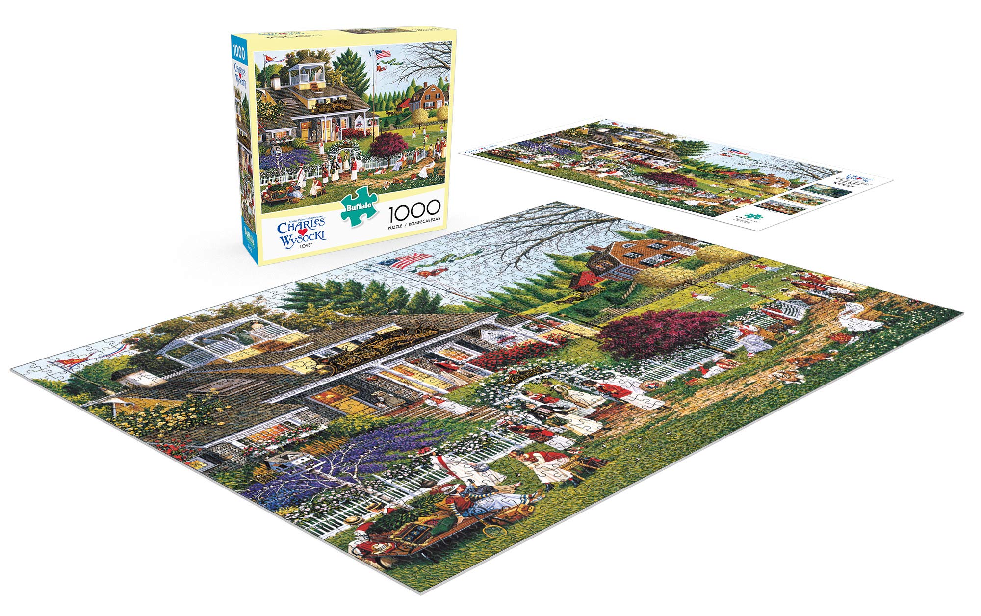 This 1000 piece jigsaw puzzle from famed folk artist Charles Wysocki will take you back in time as you enjoy a true slice of Americana living. Every Charles Wysocki puzzle is incredibly detailed. For more than 40 years Charles Wysocki enjoyed his love affair with life and Americana, and through his imaginative and colorful artwork touched the hearts of millions worldwide. "Chuck" felt a special kinship with puzzlers, who share in the creative process by building his paintings one piece at a time. Every Buffalo Games jigsaw puzzle is manufactured in the U.S.A. from recycled puzzle board. A precision cutting technique guarantees that every piece will fit soundly with the company's signature Perfect Snap. A bonus puzzle poster is also included so that you have a handy reference of what the completed puzzle should look like while you put yours together.
