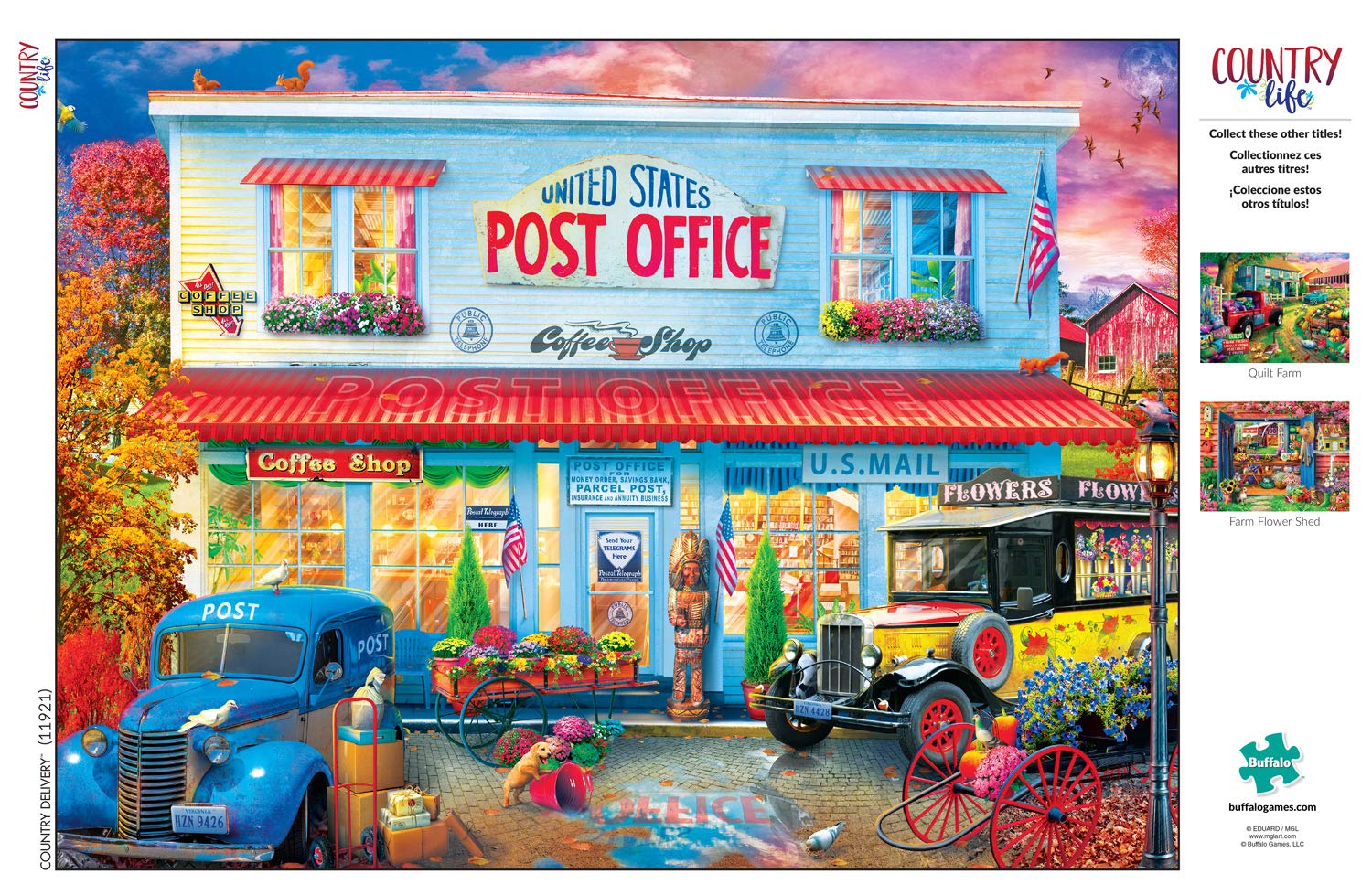 This 1000-piece jigsaw puzzle, Country Delivery, is from the Country Life series by Buffalo Games. As you enjoy life in the country on an autumn day you can make one stop at the Post Office and grab a coffee, flowers or even make a phone call! The Country Life series is chock-full with layered images of flowers, birds, quilts, wheel barrows, flags, dogs, and other rustic themed images. Every Buffalo Games jigsaw puzzle is manufactured in the United States from recycled puzzle board. A precision cutting technique guarantees that every piece will fit soundly with the company's signature Perfect SnapTM. A bonus puzzle poster is also included so that you have a handy reference of what the completed puzzle should look like while you put yours together.
