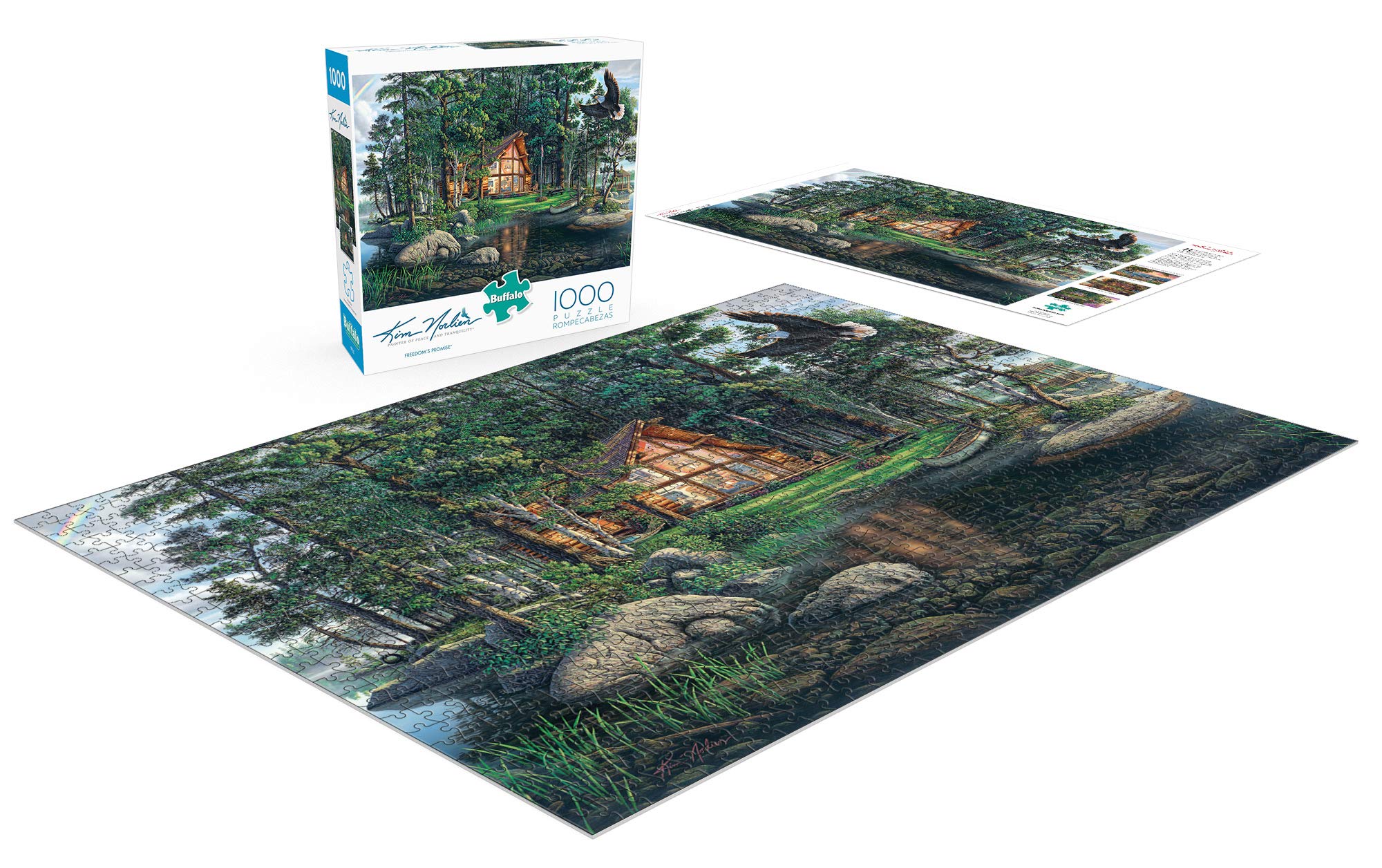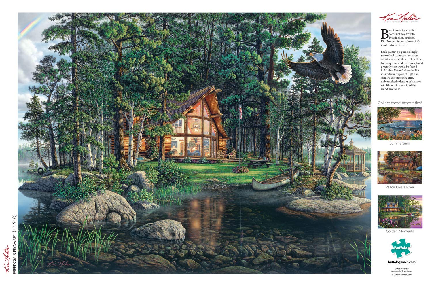 A bald eagle soars near a secluded lake-front cabin in this beautiful 1000-piece jigsaw puzzle by renowned artist Kim Norlien. Fine details like a rainbow in the distance, a picnic lunch and a relaxing hammock make this puzzle a delight to piece together. Best known for creating scenes of beauty with breathtaking realism, Kim Norlien is one of America’s most collected artists. He has exhibited his art in shows throughout the United States and his museum-quality originals are highly regarded by collectors. His masterful interplay of light and shadow celebrates the true, unblemished splendor of nature’s wildlife and the beauty of the world around them. Each painting is painstakingly researched to ensure that every detail - whether it be architecture, landscape or wildlife - is captured precisely as it would be found in its natural state. Painting predominantly in acrylics, the result of Norlien’s work is subtle, yet powerful - vibrant, lifelike and compelling. His award-winning nostalgia pieces capture the joy and simplicity of days gone by, while his equally captivating wildlife scenes invite viewers to peacefully gaze upon wildlife in its natural state. In addition to his highly detailed painting style, Norlien has become well known for his use of hidden images within many of his paintings. He believes these hidden images can be conversation pieces for guests and can give families, adults and children something to enjoy together. Every Buffalo Games jigsaw puzzle is manufactured using premium quality 100% recycled paperboard. s signature Perfect SnapTM. A bonus puzzle poster is also included so that you have a handy reference of what the completed puzzle should look like while you put yours together.