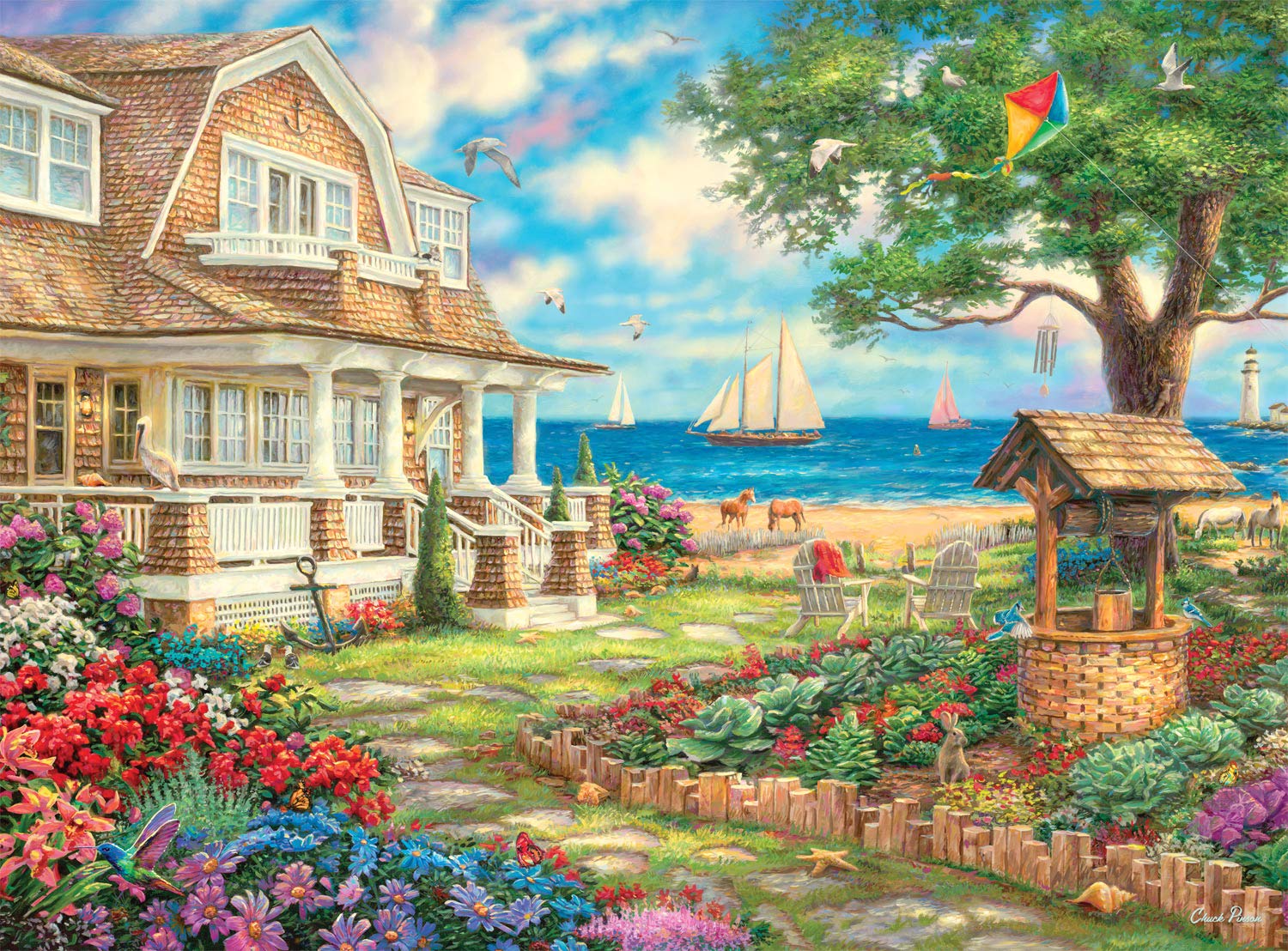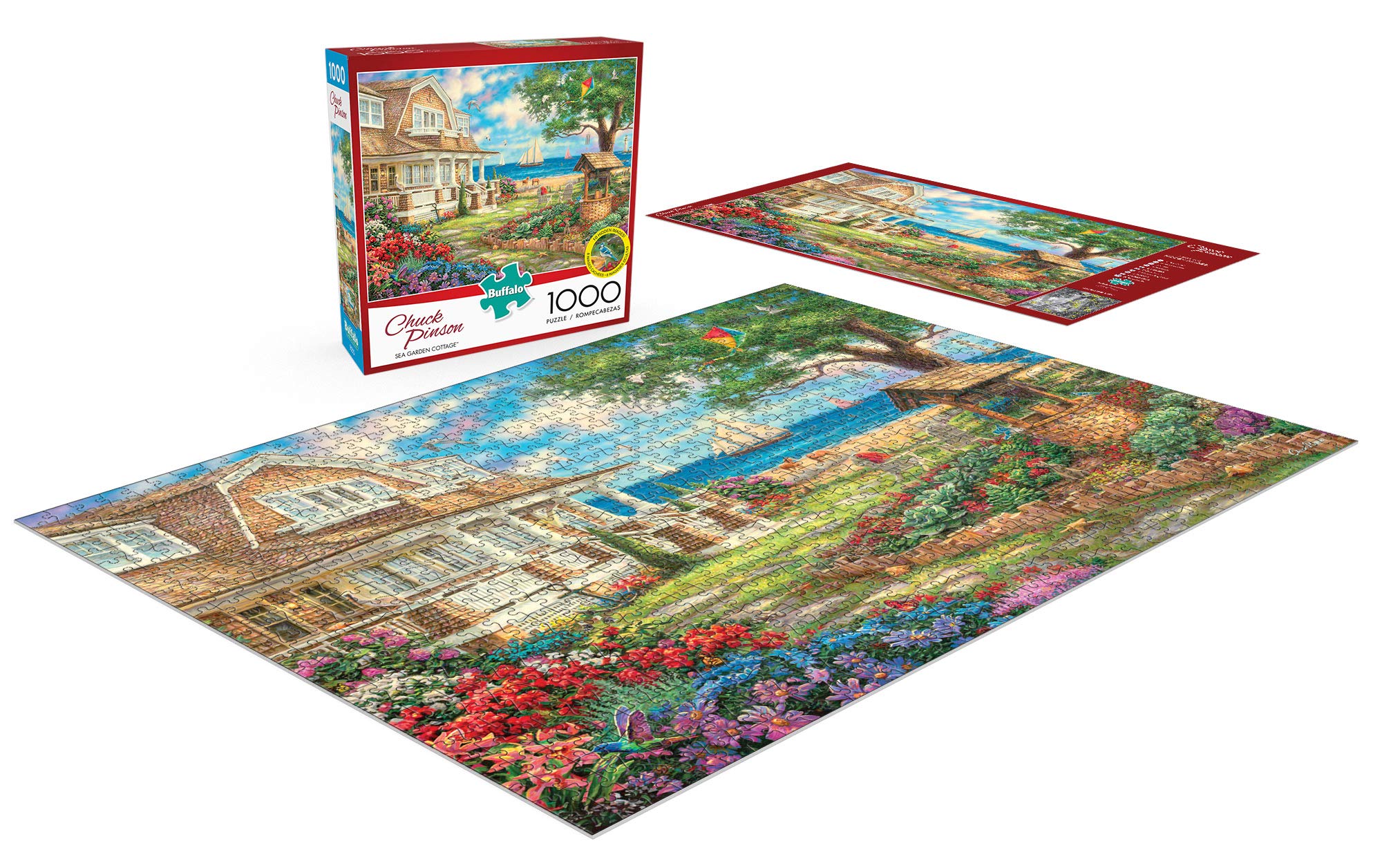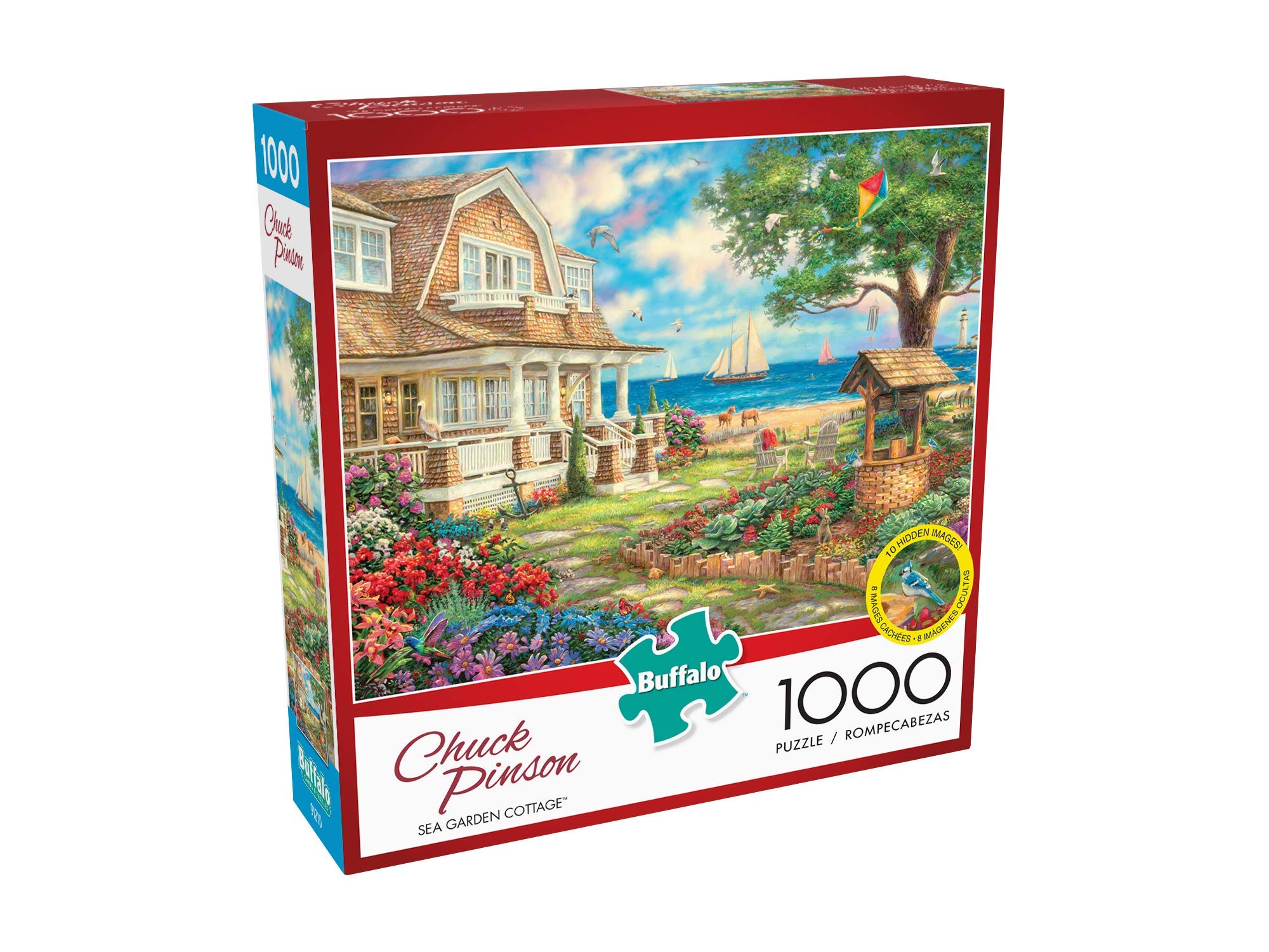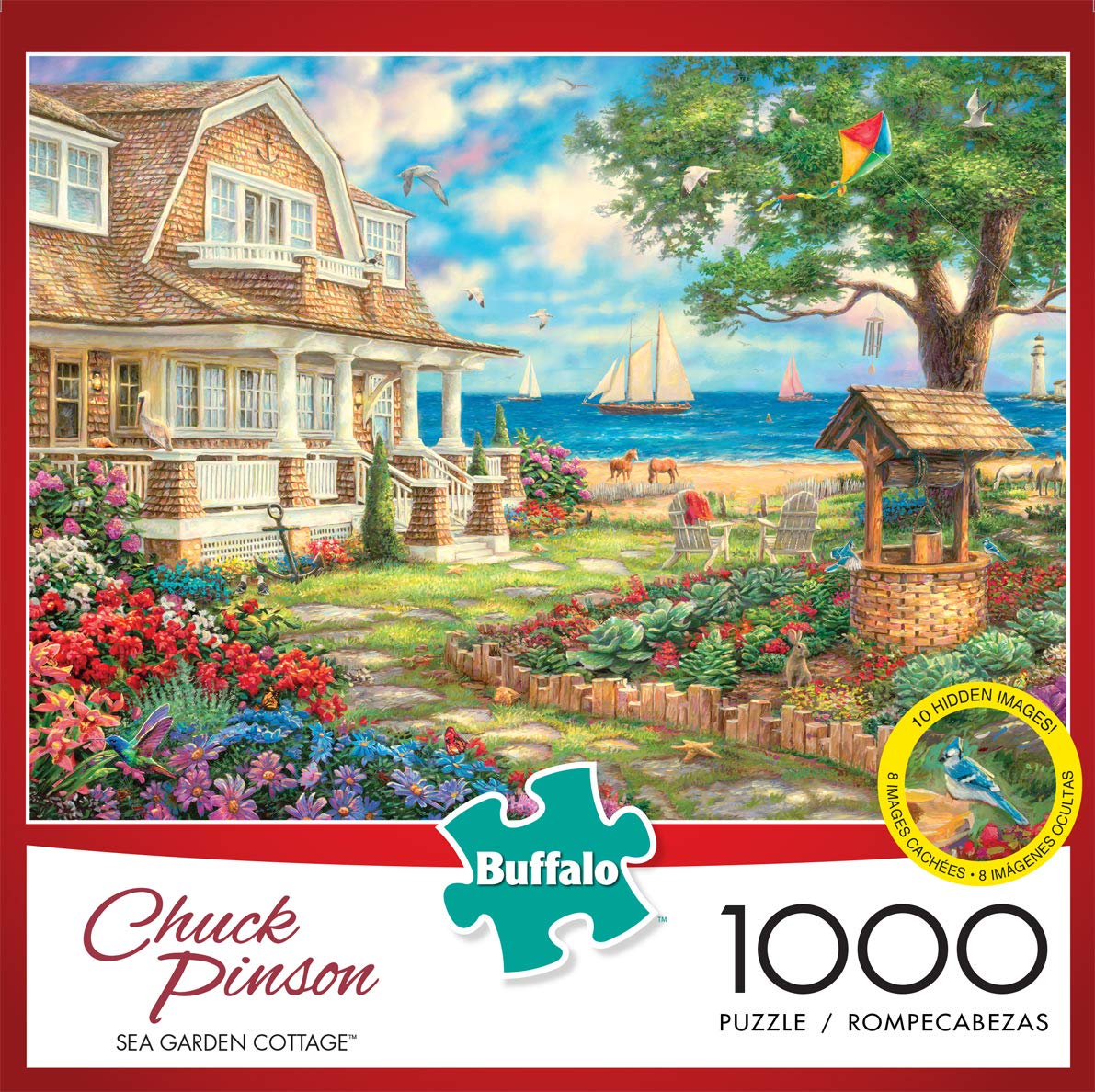 Enjoy piecing together this beautiful cottage, located just beside the sea. This 1,000-piece puzzle, Sea Garden Cottage, is by Buffalo Games and based on the artwork of Chuck Pinson. This puzzle has 10 hidden objects so keep your eye out! Every Buffalo Games jigsaw puzzle is manufactured from recycled puzzle board. s signature Perfect Snap™. A bonus puzzle poster is also included so that you have a handy reference of what the completed puzzle should look like while you put yours together.