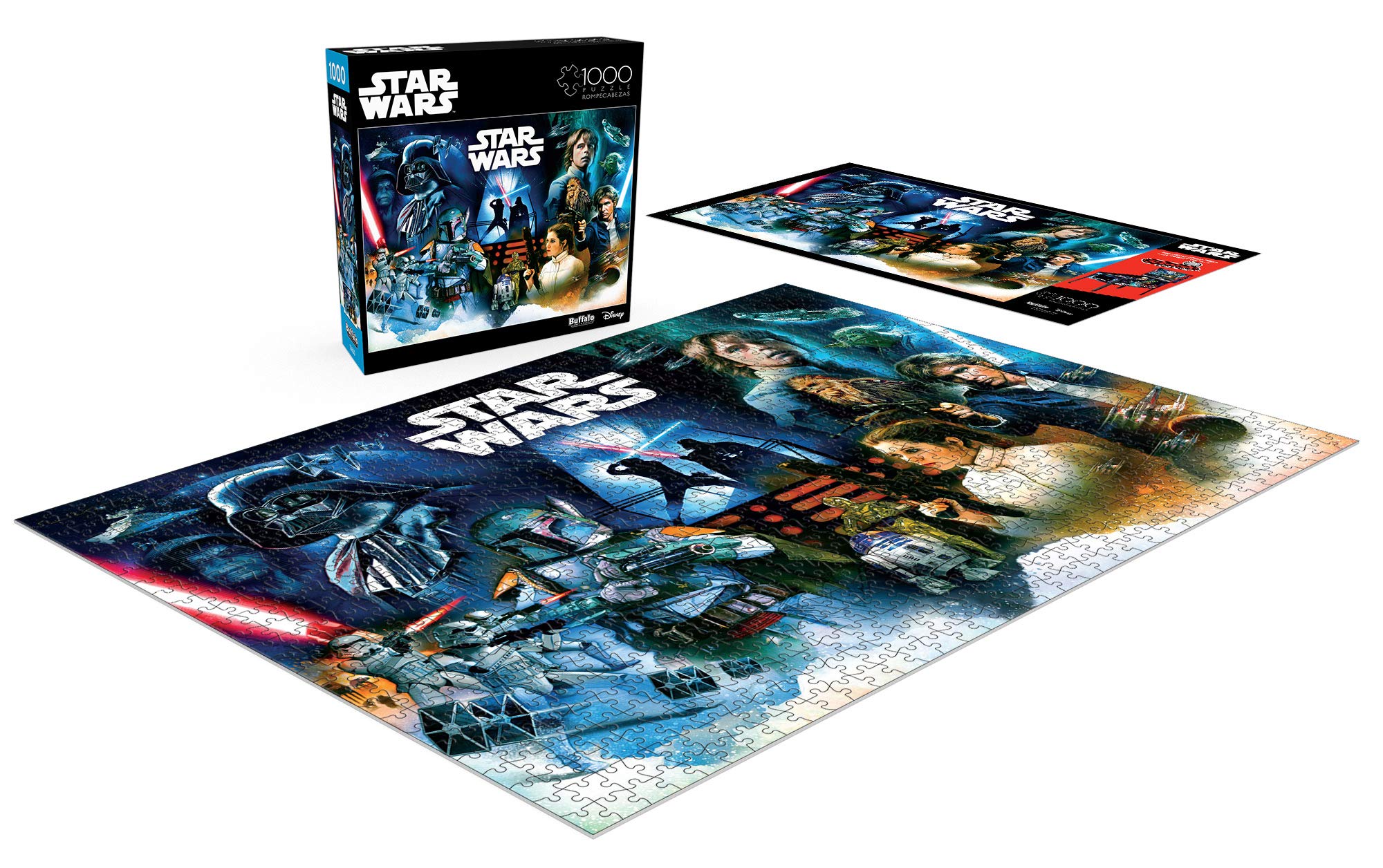 Pinball Art is a 1000-piece jigsaw puzzle featuring artwork that is found only on Stern Pinball® Star Wars™ pinball machines. This image is a collage of characters and scenes from the original Star Wars trilogy including Darth Vader™, Luke Skywalker™, Han Solo™, Chewbacca™, Princess Leia™, R2-D2™, C-3PO™, Boba Fett™ and more. Piece together the dynamic action representing both the light side and the dark side of the Force in this detailed illustration! Every Buffalo Games jigsaw puzzle is manufactured from recycled puzzle board. s signature Perfect Snap™. A bonus puzzle poster is also included so that you have a handy reference of what the completed puzzle should look like while you put yours together.