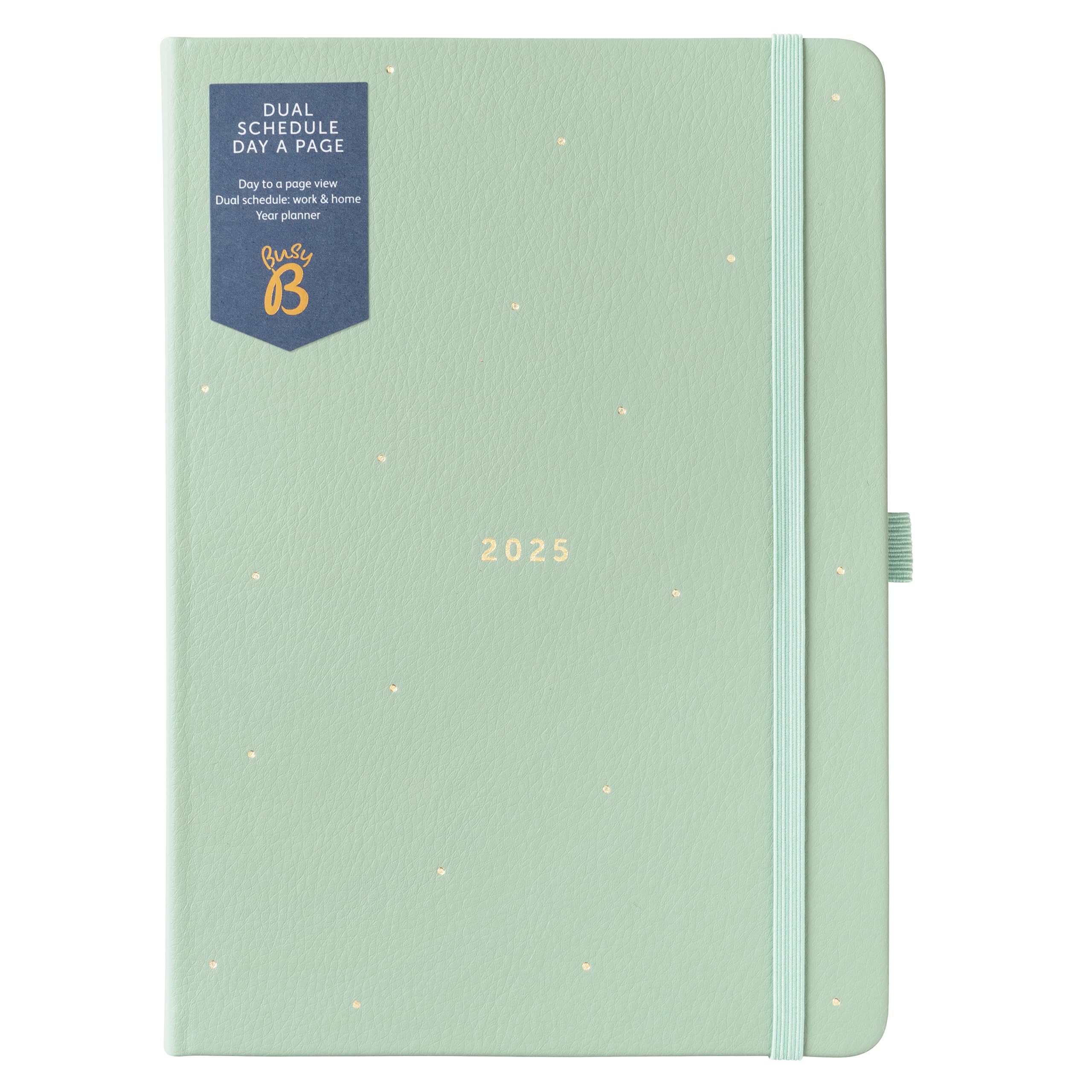 DescriptionElevate your planning with the Busy B Dual Schedule Day A Page Diary. This A5 sage diary runs from January to December 2025, featuring a luxurious faux leather cover adorned with elegant gold foil details. Its compact size (15 x 21.5cm) fits easily in your handbag or on your desk, making organisation a breeze wherever you go. Balance work and life effortlessly with this clever dual-schedule layout. Divide your day as you see fit, with ample space to record daily priorities for both aspects of your life. Whether you're juggling multiple projects or coordinating family activities, this diary adapts to your unique needs, helping you stay on top of everything. Designed with the modern planner in mind, this diary boasts practical features to enhance your organisation. An elastic closure band keeps everything secure, while a handy pen loop ensures you're always ready to jot down ideas. The ribbon page marker helps you quickly find your place, making this FSC-certified diary a must-have for the well-organised individual.
