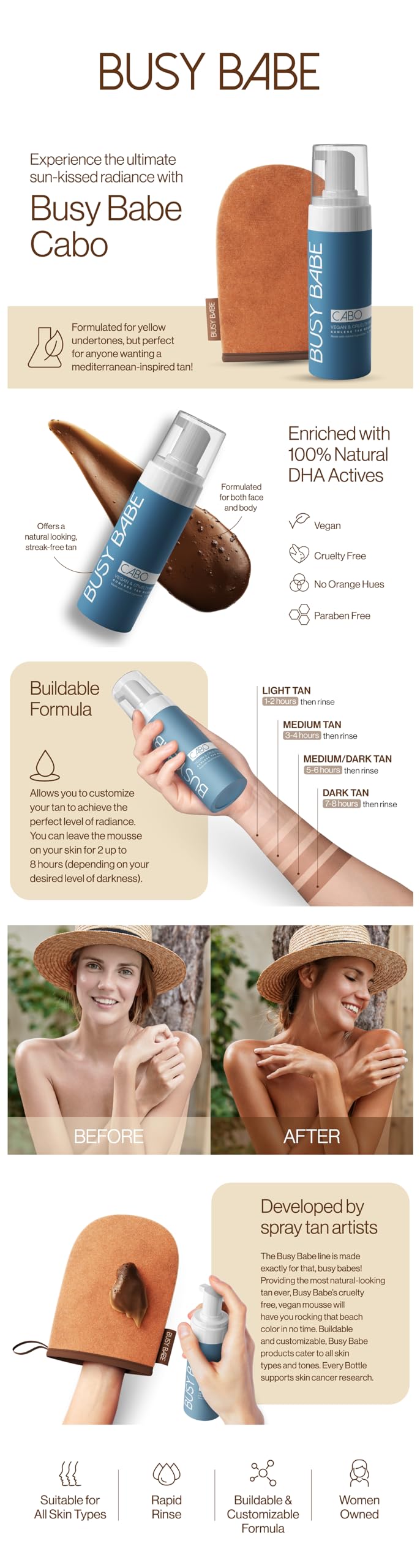 Introducing Busy Babe Cabo Rapid Fast Natural Dark Bronze Self Tanning Mousse! This revolutionary self tanner is ideal for all skin types and tones. Formulated with natural ingredients and organic botanicals, this product will give your skin the beautiful sunless bronzed glow you've always wanted. Its cruelty free and vegan, so you can feel good about what you're putting on your body and it can be applied easily with the included application mitt for an even tan! Busy Babe Cabo rapid fast self tanning mousse is one of the most popular self tanners best sellers, and is the perfect choice if you're looking for a natural-looking bronze glow. Whether you're trying to get that summer beach look or just want to maintain a subtle sun-kissed glow year round, our product has got you covered. Plus, unlike many fake tans, Busy Babe won't leave you smelling like a bottle of tanning lotion! Take your bronzing game up to the next level with Busy Babe Cabo Rapid Fast Natural Dark Bronze Self Tanner Mous, the best choice in luxury skincare products. Buy now and get glowing! BUSY BABE CABO IS FORMULATED FOR SKIN WITH YELLOW UNDERTONES BUT CAN BE USED ON ANYONE LOOKING FOR A MEDITERRANEAN INSPIRED TAN. **EVERY BOTTLE SUPPORTS CANCER RESEARCH!**