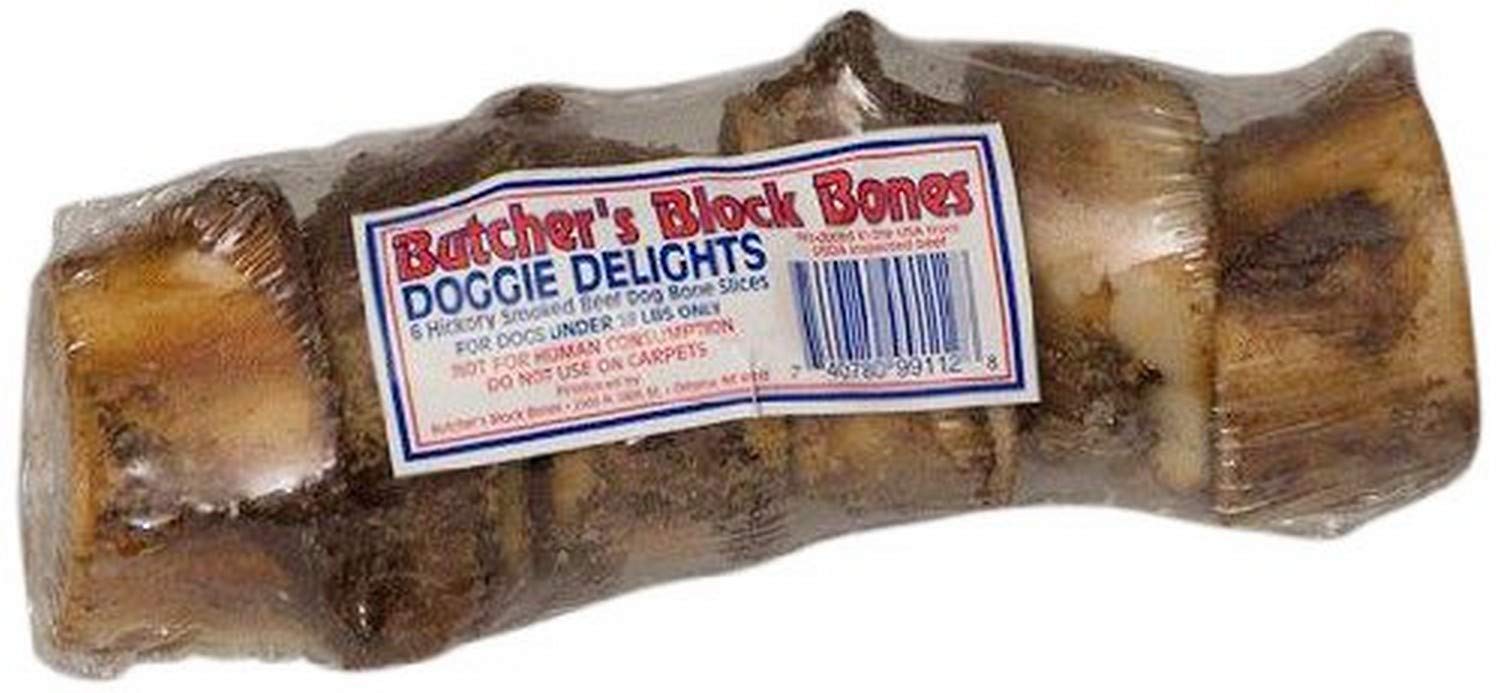 From Butcher's Block Bones, Doggie Delights Smoked Femur Slices are ideal for dogs 18 lbs and under. Smoky and slow roasted to develop flavor, Doggie Delights are an all natural chewing treat. All products are hand selected from a US human grade facility located in Nebraska from USDA inspected Beef. Bones & Treats are hand trimmed and 100% natural. Products are derived from younger and extremely healthy cattle to assure best flavor and quality. Bones have excellent dental benefits for the dog. Bones provide hours of activity for the dog, relieving boredom and satisfies the urge to chew. Our 100% Beef Treats are an excellent source of vitamins and minerals.