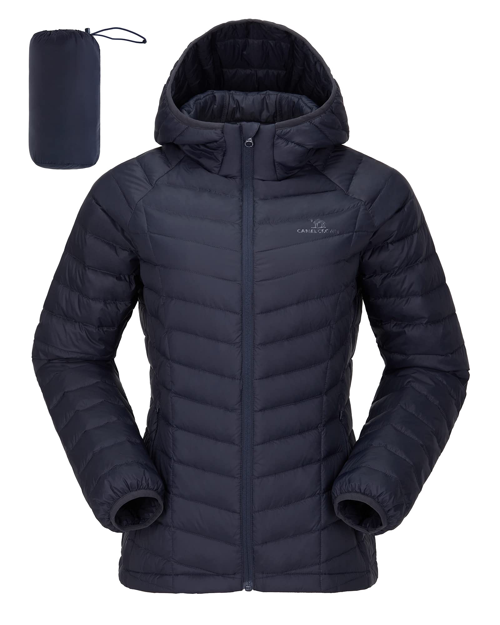 CAMELSPORTS Women's Down Jacket Hooded Winter Light Weight Short Puffer Coats with Thermal Heat Reflective Lining Packable Warm Windproof Ladies Parka Fashion