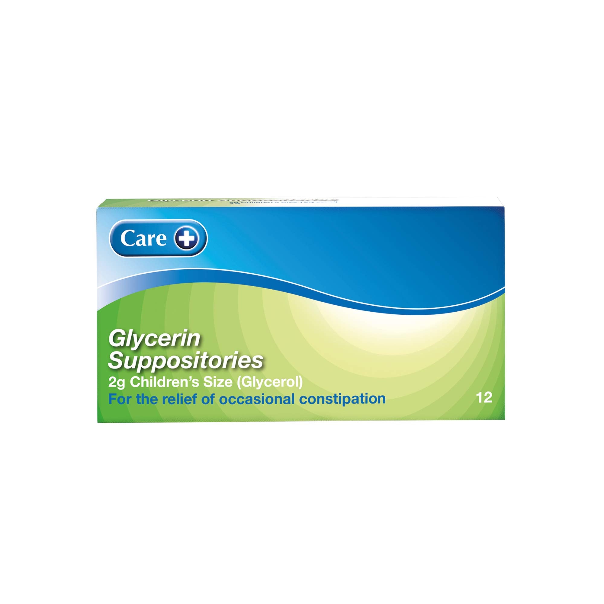 DescriptionProduct Description2g Children's Size (Glycerol), 12s For the relief of occasional constipation Care Glycerin Suppositories help to stimulate bowel movement and can be used for children over one year. Glycerol BP 70% 2g Suitable for children 1+ Available in 12 suppositories More about this Product Directions for use Recommended Doses One Suppository Dosage Schedule The suppository should be dipped in water before insertion. The suppositories are defined as children’s size, therefore there is no infants’ or adult’s use recommendation. See the product label for more information. There is the leaflet included in the pack with a medicine. It gives information about taking or using a medicine. It is possible that the leaflet in your medicine pack may differ from this version because it may have been updated since your medicine was packaged. If in doubt, always talk to a healthcare professional. Essential Information: Glycerin Suppositories BP 2g Children’s size. For the relief of occasional constipation. Contains Glycerol. Always read the label. Who can use this Product: It can be used by children 1+. Use only if advised by a doctor. Product benefits/USPs: Suitable for children 1+ Relieves occasional constipation Suitable for children with constipation Helps to stimulate bowel movementIngredientslycerol, gelatine and purified water.Manufacturer Contact InformationThornton & Ross Ltd., Huddersfield, HD7 5QH, UK