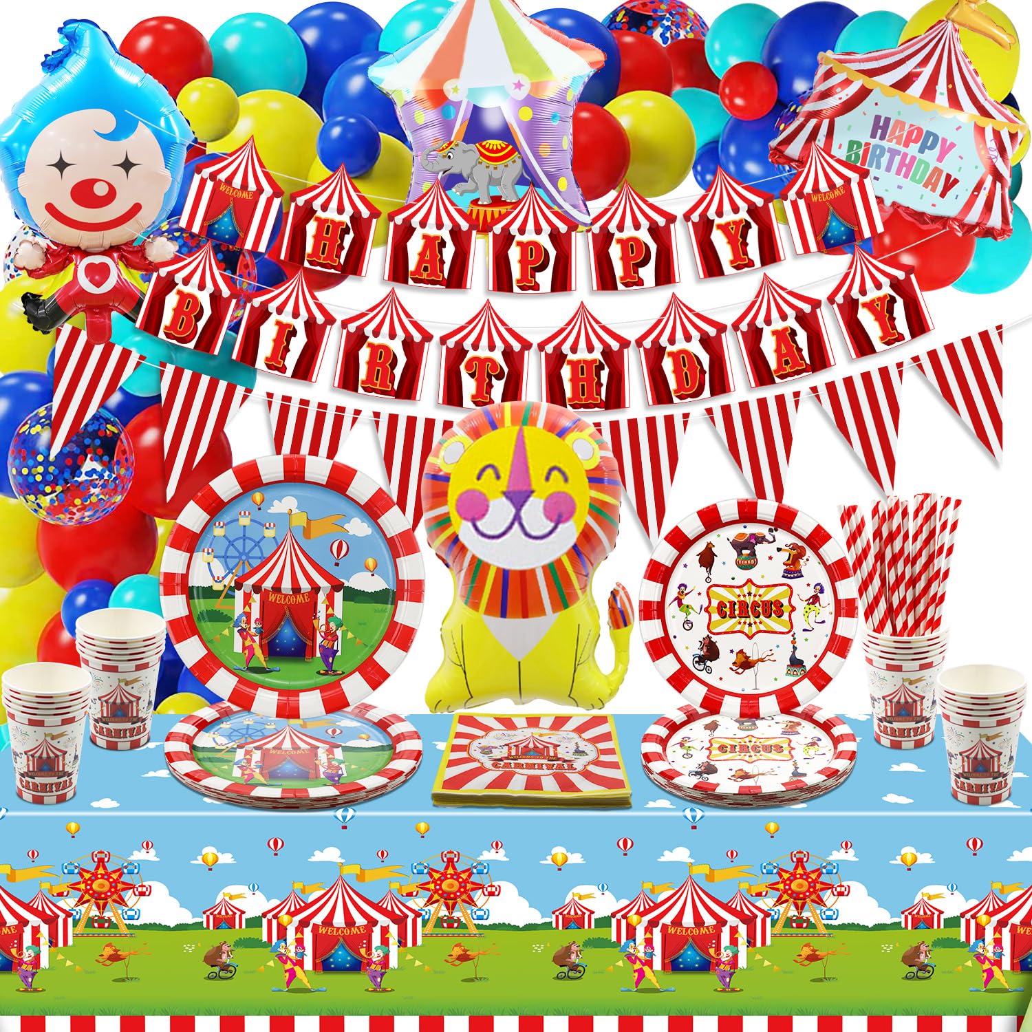 Carnival Party Supplies, Include Carnival Banner, Birthday Banner, Tablecloth, Balloons, Paper Plates, Napkins, Cups, Circus Carnival Party Decorations for Kids Boys Girls Birthday Party, Serves 20