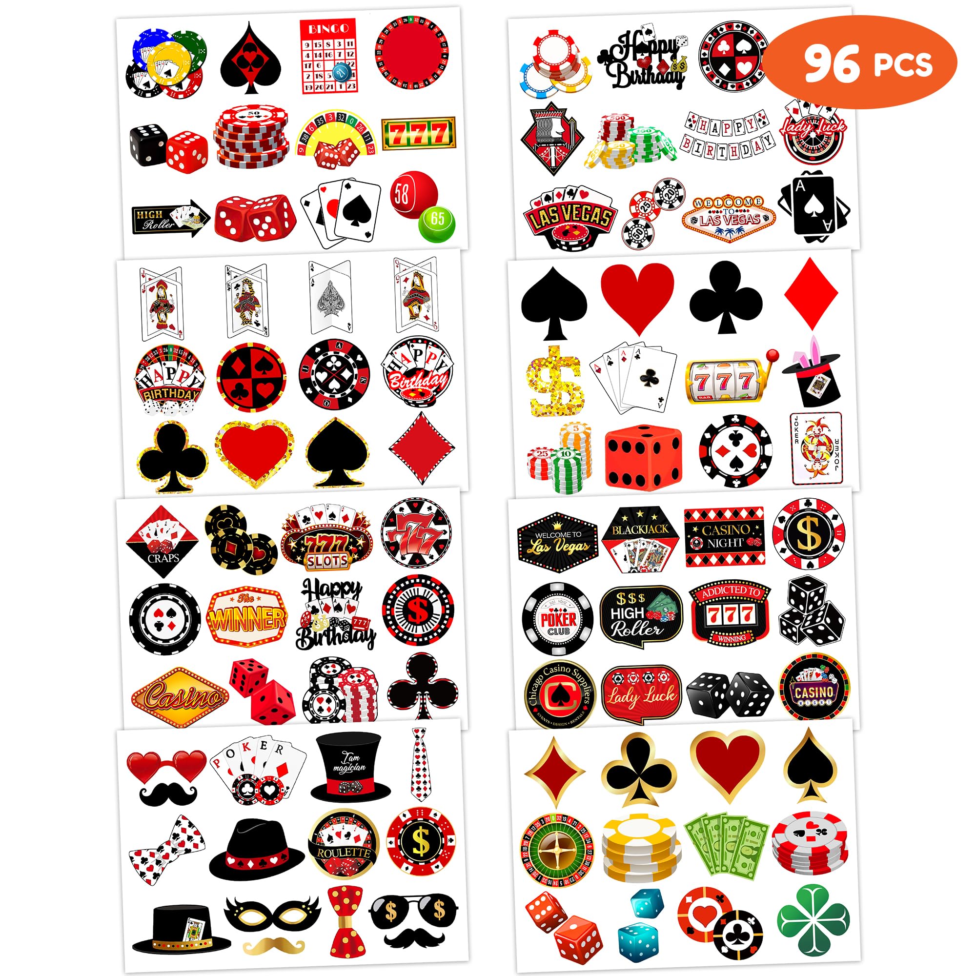 Casino Party Supplies: 8 Sheets Casino temporary tattoos stickers, Have a variety of cartoon themed characters, Children can easily Casino stickers and take unique photos to make fond memories. The size of each sheet is 6.1 * 3.1 inches. Casino Party Decoration: The set contains instructions for use and is easy to use. Casino tattoo stickers can be applied on arms, face, hands, neck, shoulders, legs, wrists and ankles to make you look cool at all kinds of parties. Popular hit with your kids. You can apply them to your body or some smooth objects, for example, glass, stationery, paper, crafts cups, cabinet, bottle. Cute And Funny Casino Themed Tattoos: Cute Casino Temporary tattoos Stickers, features an assortment of themed characters, colors are bright, and designs are adorable, use them as party favors and your kids will love. Perfect for themed party, birthday activities, school reward and other party events. They will be your kids' favorite small gifts. More Safety & Healthy Choice: These temporary tattoos are made of high quality safety and green paper, Non-allergenic, Non-toxic and totally safe for your kid's skin. Simply wet the tattoo with water and stick transferred them onto your body, hands, faces and arm you like. Tattoos will last from 3 to 5 days ,it also can be easily removed with baby oil, makeup remover or rubbing alcohol. Not recommended for people with a history of sensitive skin, if symptoms appear, stop using immediately. How to Use: Cut out tattoo of choice and remove clear sheet. Place tattoo face down on skin. Wet the tattoo thoroughly with a sponge. After 20-30 seconds, gently remove the backing paper. Allow the tattoo to dry. Very easy to use.