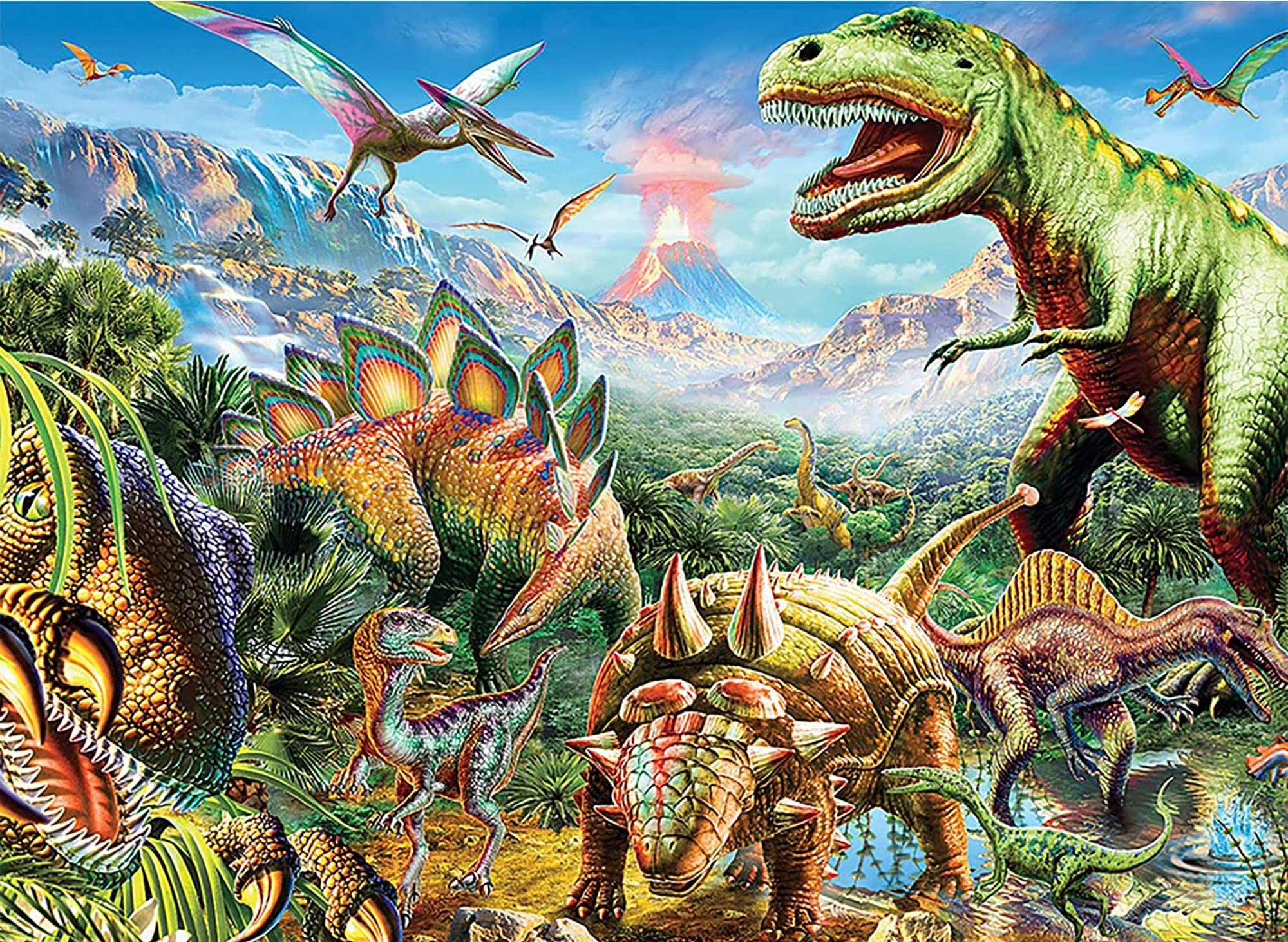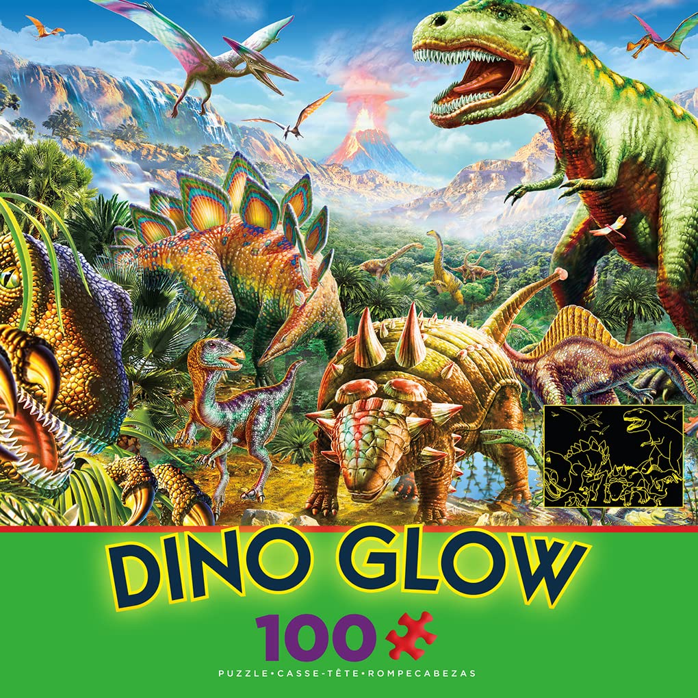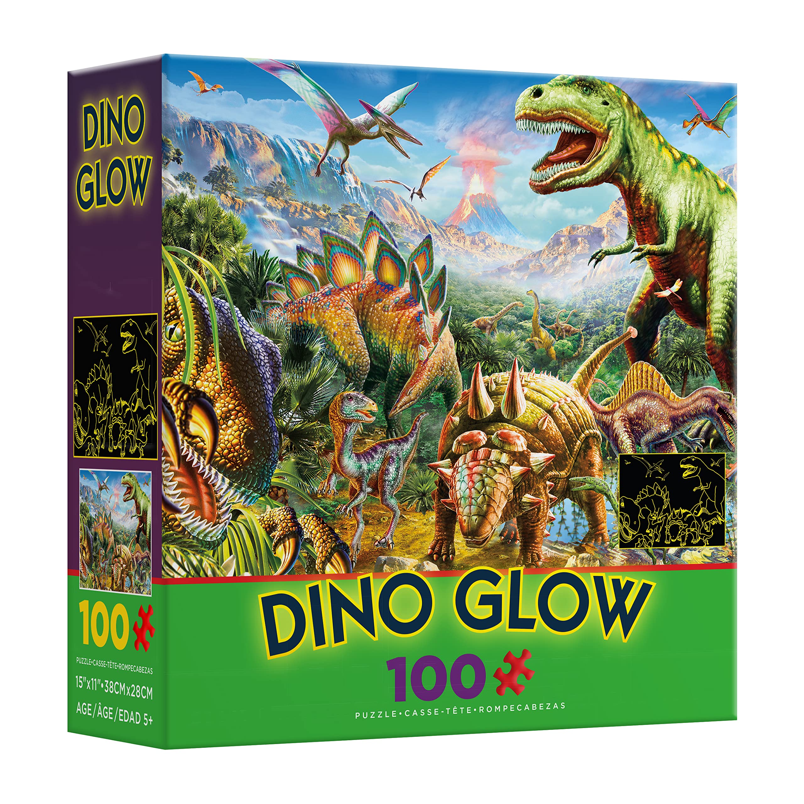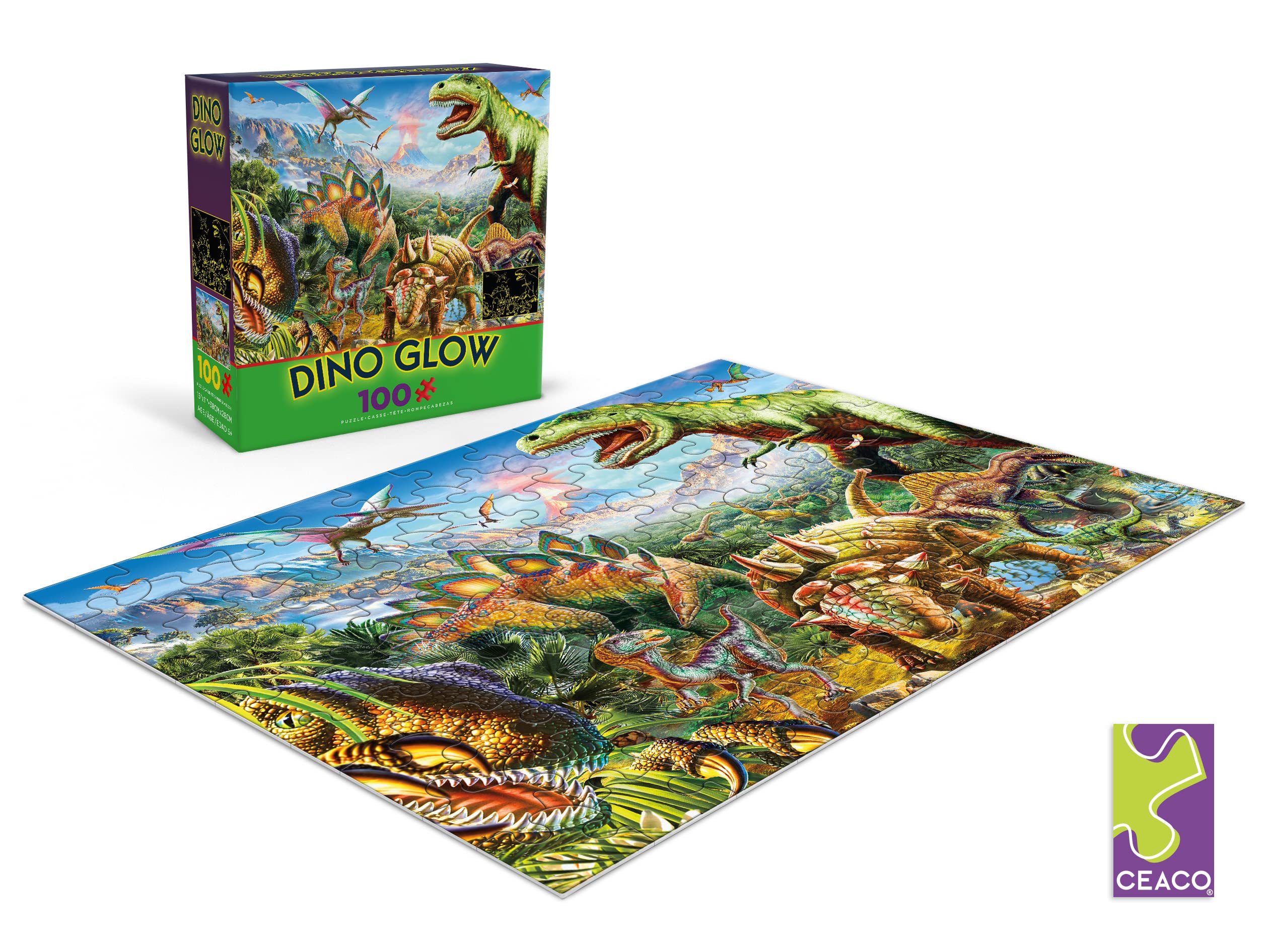 Check out this 100 piece, glow in the dark, Ceaco jigsaw puzzle that's all about dinosaurs! this is one big party and all the guests are prehistoric animals from big to biggest! how many dinosaurs can you find in the puzzle? once you are done piecing this fun and colorful puzzle together take it into the dark and watch the images glow. YES, this puzzle is double the fun!