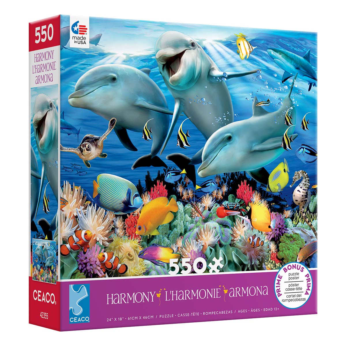 This 550 piece puzzle features vibrant image from the Harmony collection! The puzzle is 24'' x 18'' when completed and proudly made in the USA by Ceaco. Founded in 1987, Ceaco puzzles has remained true to their mission: to create high quality, innovative and challenging jigsaw puzzles and to provide hours of family fun. Ceaco puzzles pride themselves on developing and maintaining long standing relationships with some of the finest artists of their time. Ceaco talented team of puzzle designers and marketing professionals are continuously searching the world over for developing trends, emerging artists, and new technologies involving printing, die cutting and unique puzzle materials. Ceaco purpose in puzzles is clear: to continue to bring you the very best in family entertainment. Count on Ceaco puzzles for the most creative, exciting and colorful puzzles products ever!