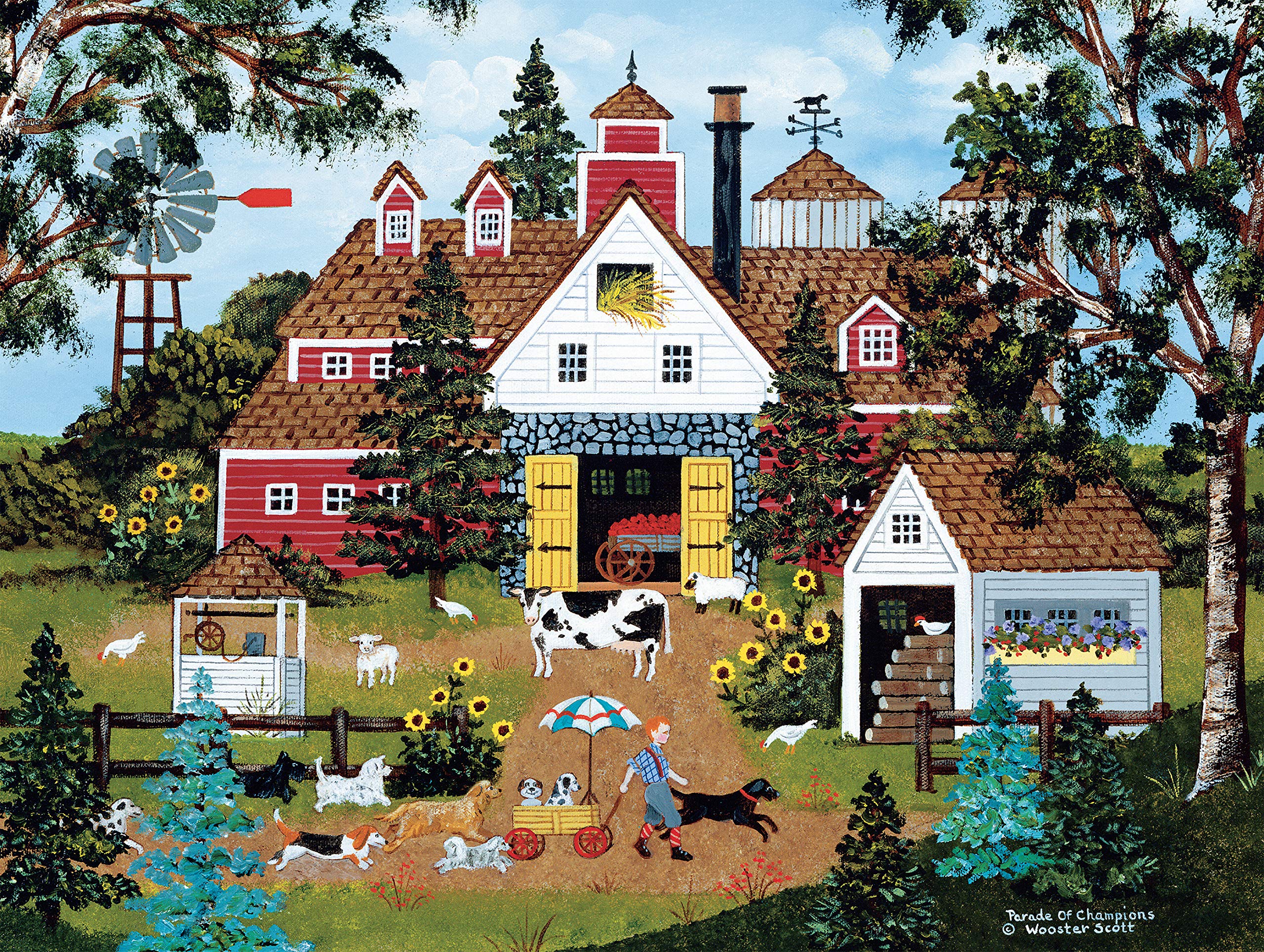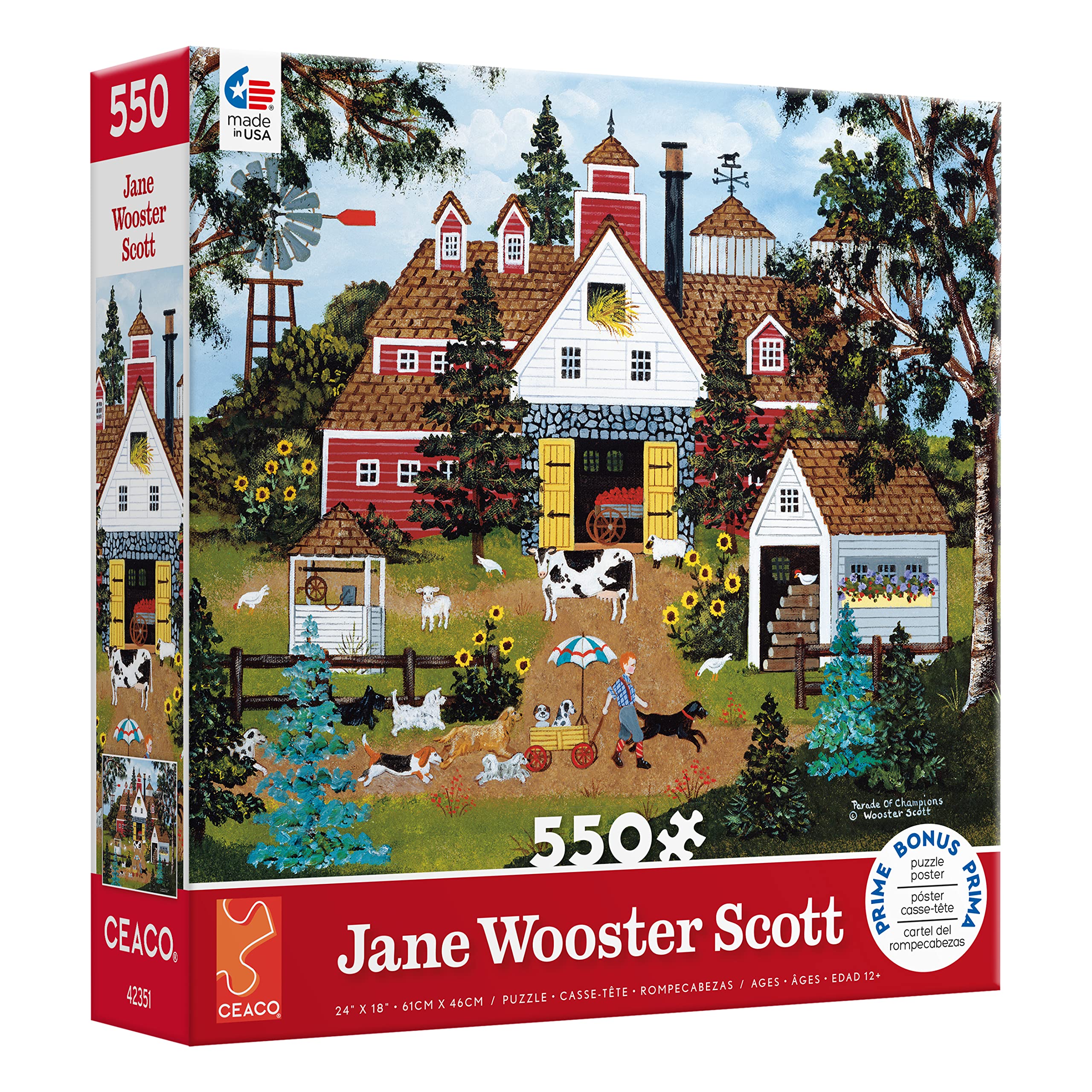 This 550 piece Americana puzzle features a Jane Wooster Scott painting of a cloudy day in a small town, with a group of people dancing in front of a barn.