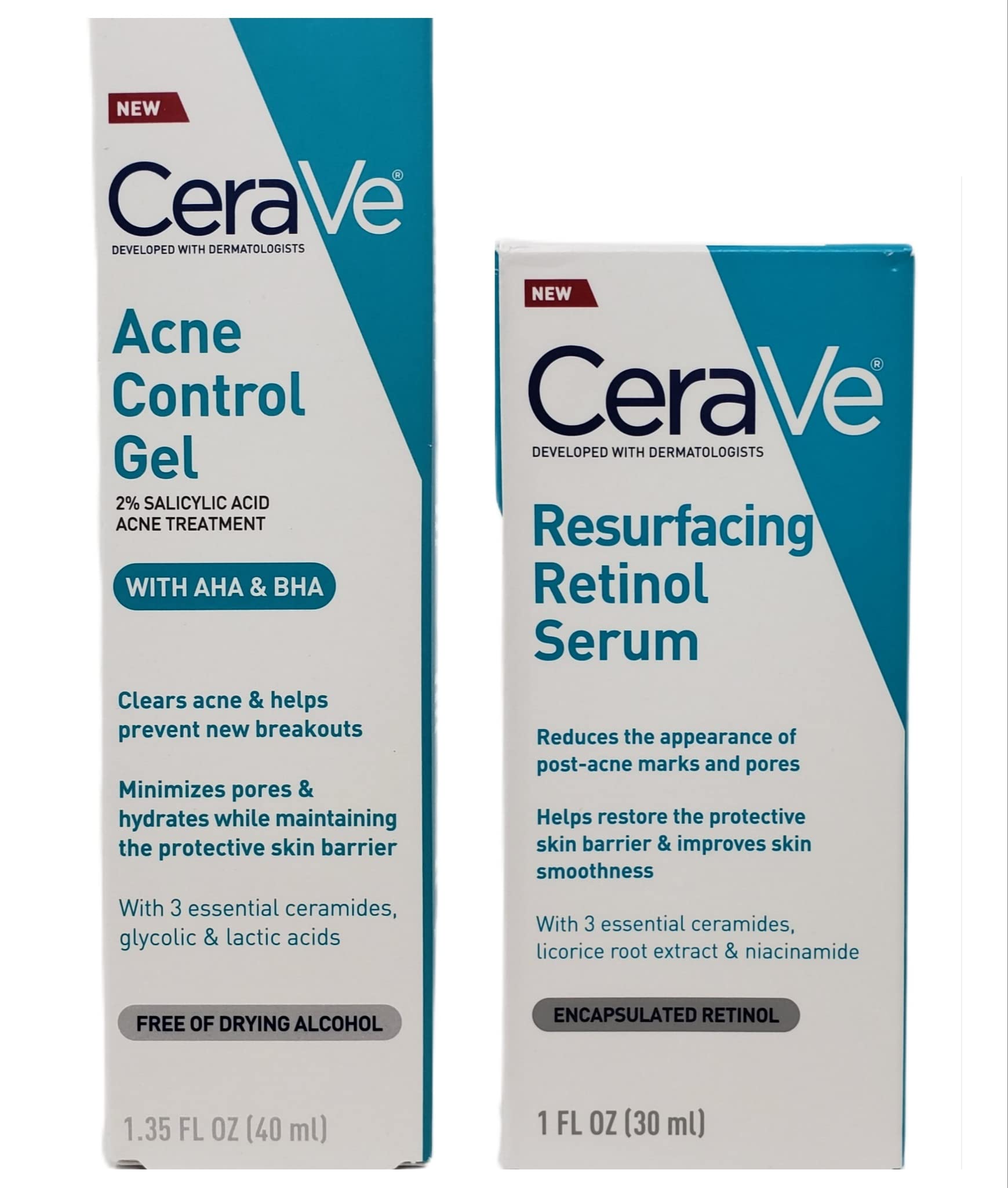 Dealing with acne is a tough thing to do, but CeraVe is here to help. In this CeraVe bundle, you will get 1 bottle of CeraVe Resurfacing Retinol Serum (1 fl oz) and 1 bottle of CeraVe Acne Control Gel (1.35 fl oz). Both of the CeraVe products in this bundle are gentle on the skin. They each have technology to prevent your skin from feeling dry, or unhealthy.