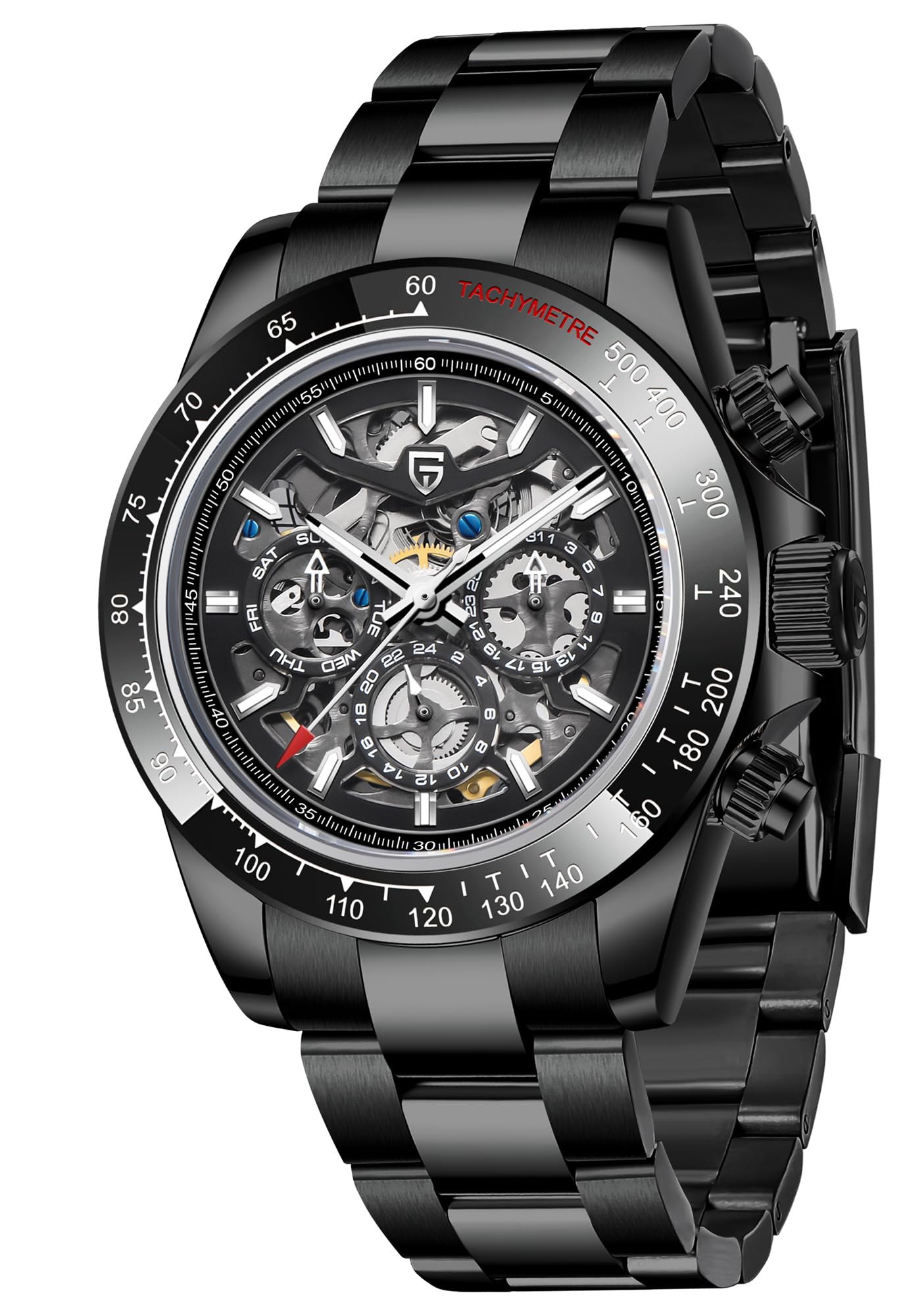 Experience the perfect blend of functionality and style with the Pagani Design Men's Skeleton Automatic Mechanical Watch. The captivating skeleton dial gives a glimpse into the watch's intricate mechanics, adding a unique touch to your wrist. Equipped with multi-functional features, including a 24-hour clock, week, and date display, this wristwatch ensures you stay on top of your busy schedule.